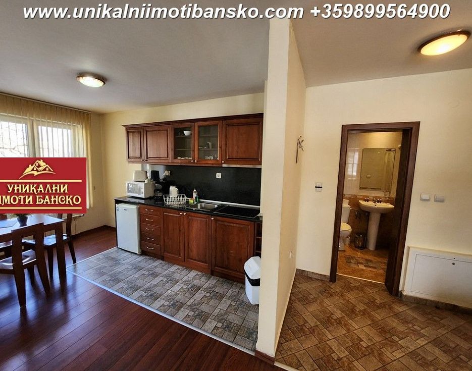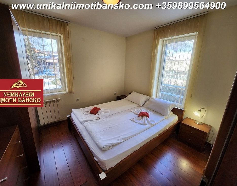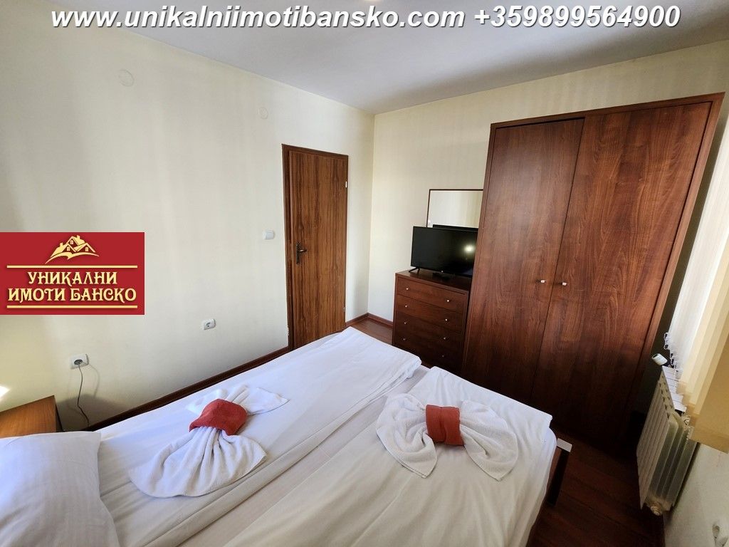 БЕЗ КОМИССИИ ОТ ПОКУПАТЕЛЯ! Агентство «Unique Properties Bansko» предлагает на продажу ПОЛНОСТЬЮ МЕБЛИРОВАННУЮ И ГОТОВУЮ К ПРОЕЗДАНИЮ ДВУХКОМНАТНУЮ КВАРТИРУ, РАСПОЛОЖЕННУЮ В КРУГЛОДИЧНОМ КОМПЛЕКСЕ СО СПА-ЦЕНТРОМ! ОТЛИЧНОЕ РАСПОЛОЖЕНИЕ - В МЕТРАХ ОТ ГОРОДСКОГО ПАРКА И ЦЕНТРА ГОРОДА! ОТДЕЛЬНЫЕ УЧАСТКИ ДЛЯ ЭЛЕКТРИЧЕСТВА И ВОДЫ! Квартира расположена на 2 жилом этаже и состоит из прихожей, гостиной с террасой и небольшой спальни. Гостиная оборудована кухонным уголком, причем она (гостиная) имеет Г-образную форму, причем кухонный уголок расположен с одной стороны, перед ним размещены обеденный стол и стулья. В другой части гостиной диван с тахтой, перед которым журнальный столик и ТВ-секция с телевизором. Из комнаты есть выход на собственную террасу. В спальне большая двуспальная кровать, шкаф и платяной шкаф. Ванная комната оборудована душем и туалетом. Комплекс в хорошем состоянии, имеет большой благоустроенный двор. Во дворе есть скамейки для отдыха, детские игровые площадки и открытые спортивные площадки. В спа-центре есть крытый бассейн, сауна, паровая баня и тренажерный зал. Перед блоками в комплексе предусмотрены парковочные зоны, где вы можете безопасно припарковать свой автомобиль (как собственник). Помимо вышеперечисленного, в комплексе есть рецепция, ресторан и круглосуточная охрана, а вход во двор комплекса имеет шлагбаум. Отличная инвестиция в недвижимость, которую можно использовать для постоянного проживания или сдавать в аренду!