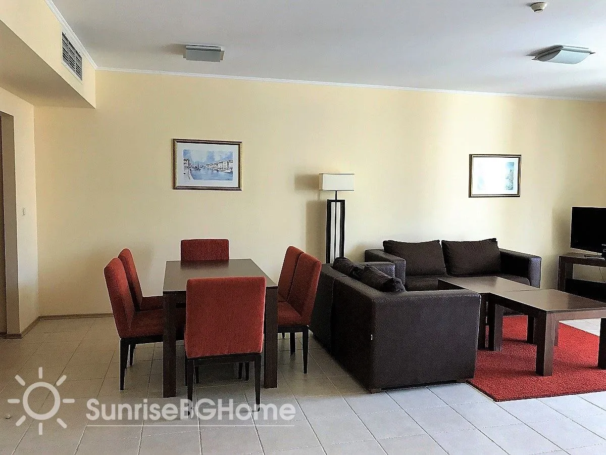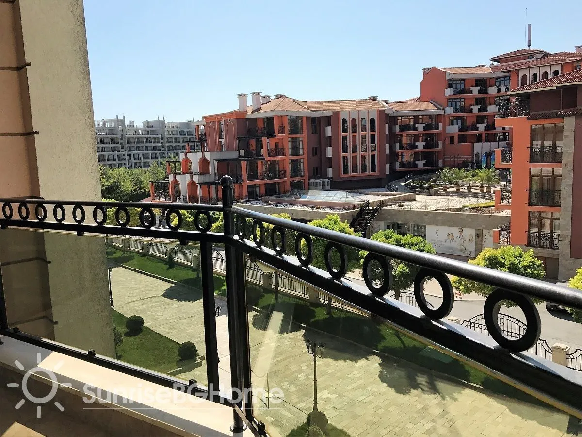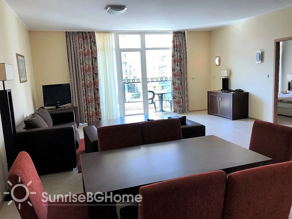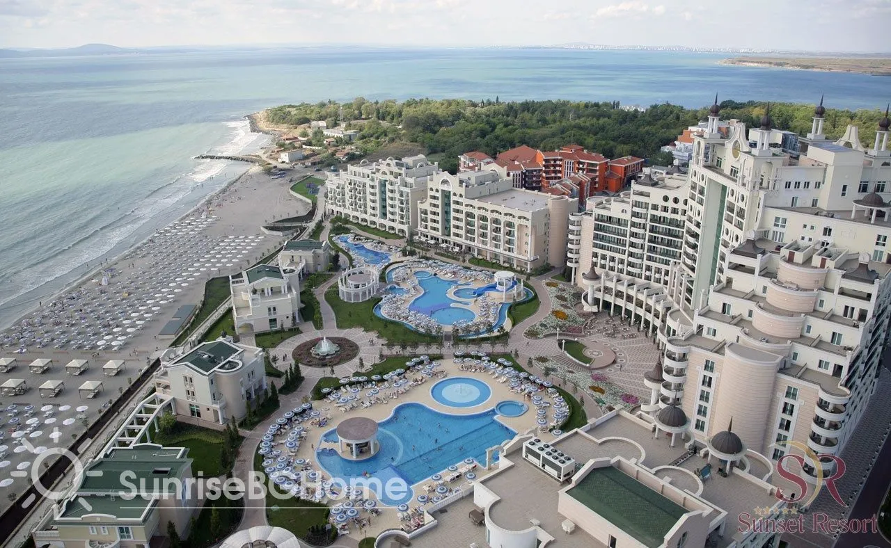 Продается меблированный и полностью оснащенный апартамент в пятизвездочном комплексе „Sunset Resort “ на первой линии моря в г. Поморие, в 15 км от города Бургас, на побережье Болгарии.