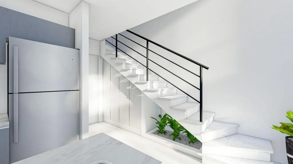 Первый этаж предлагает открытое пространство с кухней-гостиной. В гостиной уютный угловой диван и круглый журнальный столик. Заметным элементом на кухне является барная стойка для трех человек. Кухня оборудована всей необходимой техникой, включая электронную плиту, духовку, вытяжку и холодильник. В центре помещения великолепный дизайнерский светильник серебряного оттенка. У лестницы предусмотрено дополнительное пространство для хранения.