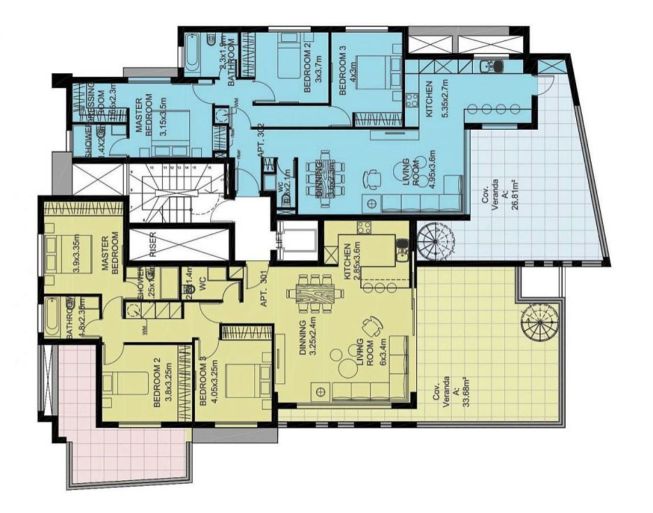 Все без исключения апартаменты располагают просторной планировкой и огромными верандами. Также все апартаменты располагают крытой парковкой и кладовой.