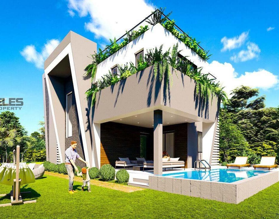 Вам представлена на фото шикарные люкс виллы. Взгляните на этот современный дизайн. Дом собственный бассейн и территория. На которой можно оборудовать зону отдыха или сад.