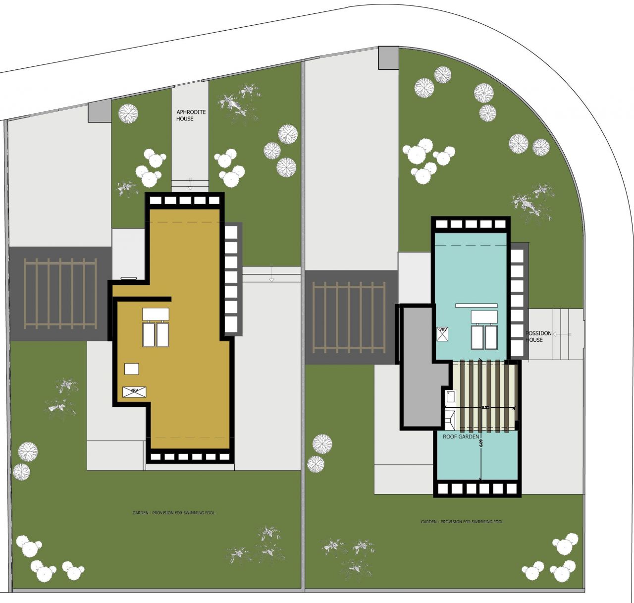 Первые два жилых дома, которые уже построены, — это Афродита и Посейдон, причем последний расположен на угловом участке и имеет сад на крыше. Каждый дом в этом жилом комплексе состоит из кухни и гостиной открытого плана, а также гостевого туалета на первом этаже. На втором этаже расположены 3 спальни (главная спальня со своим собственным санузлом) и главная ванная комната. Снаружи каждого дома есть парковка и сад, где можно разместить бассейн (по желанию).