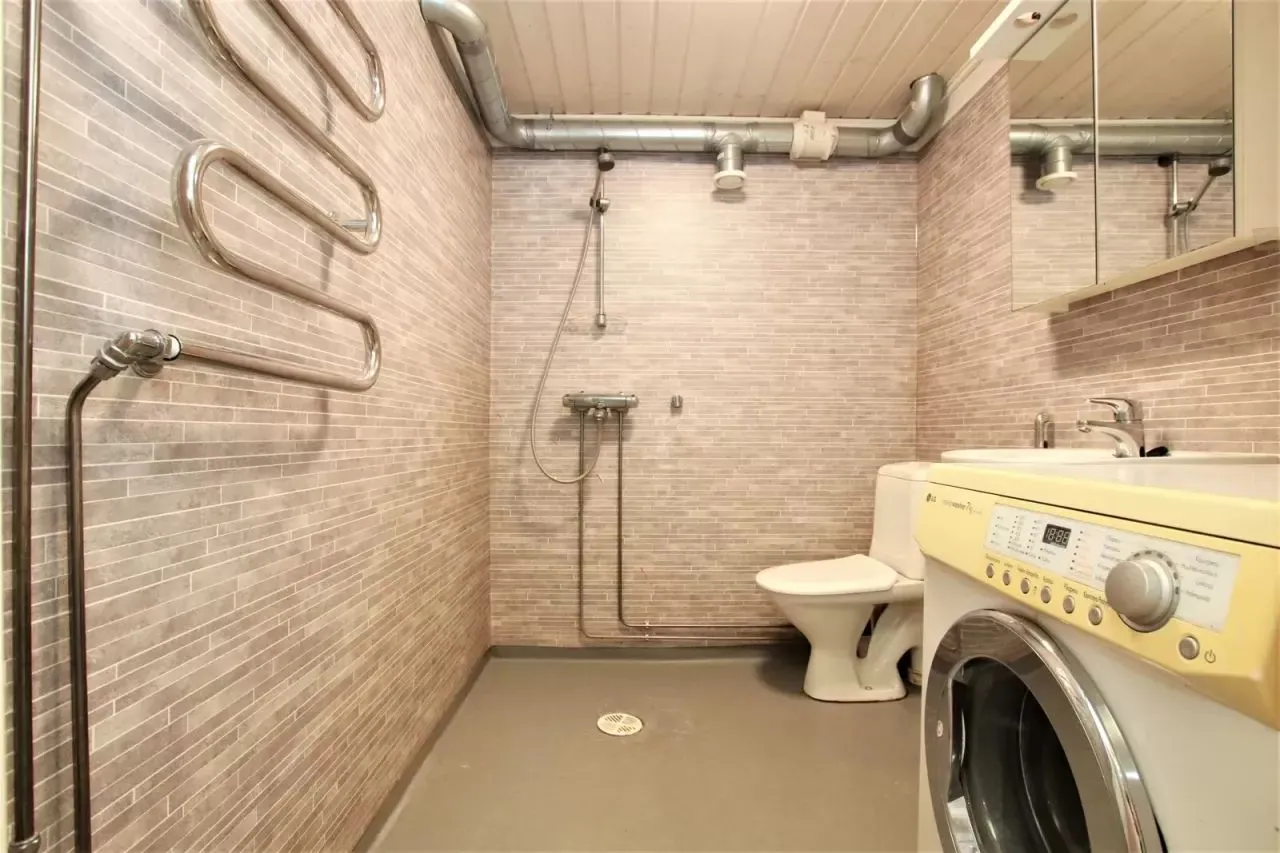 - В ванной комнате стиральная машина и полотенцесушитель.