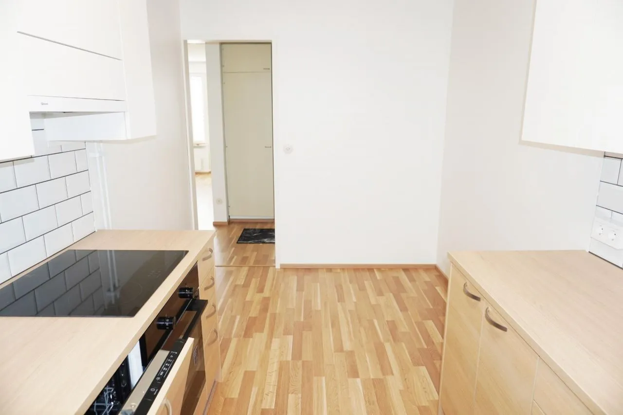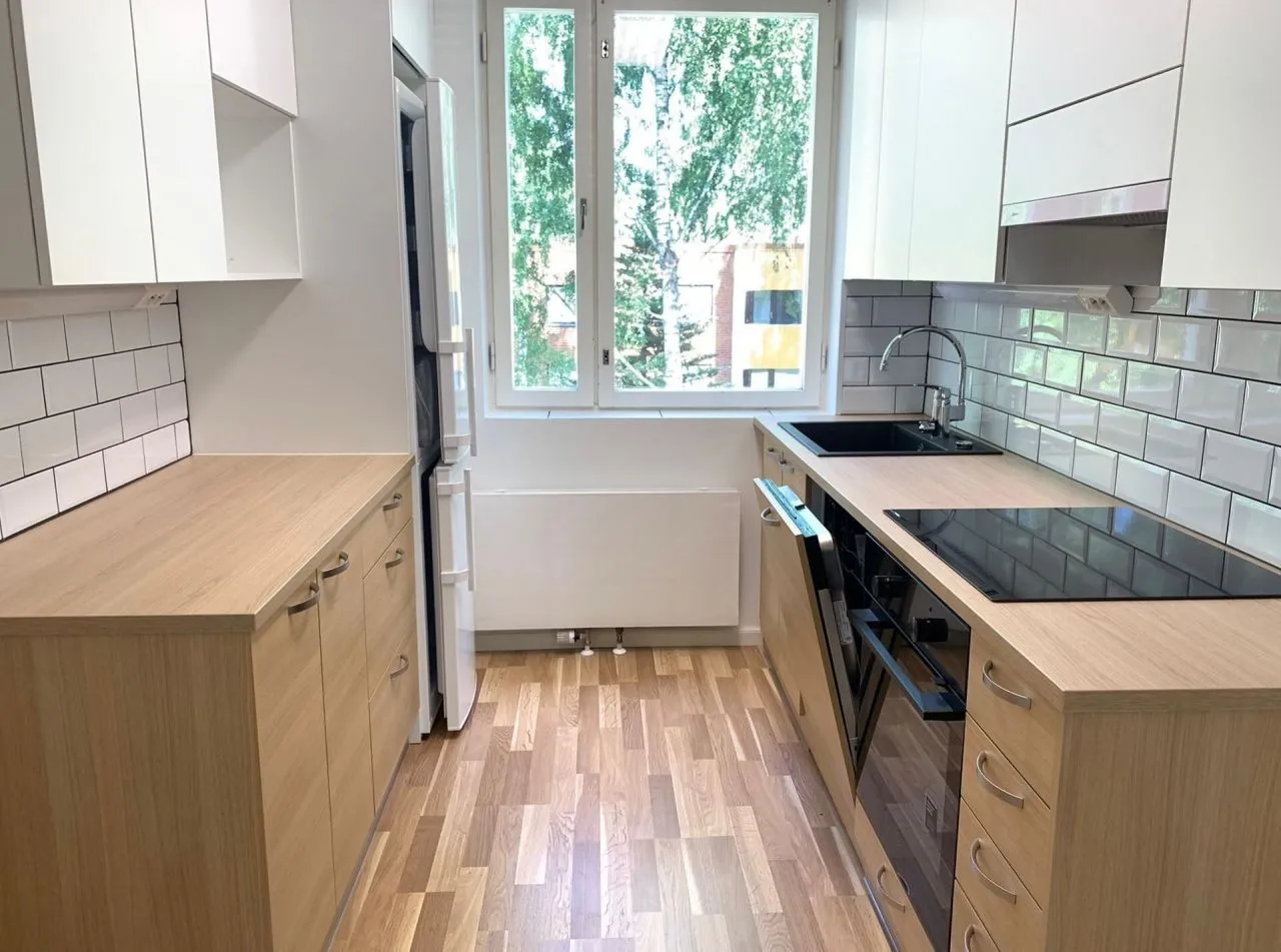 - В ходе ремонта кухня была обновлена с использованием высококачественной мебели Puustelli, а вся бытовая техника новая. Холодильник с морозильной камерой, индукционная плита, посудомоечная машина и вытяжка (фильтр с активированным углем).