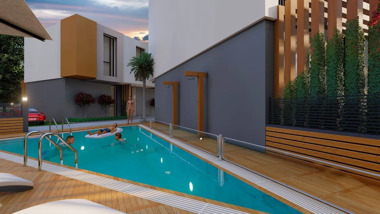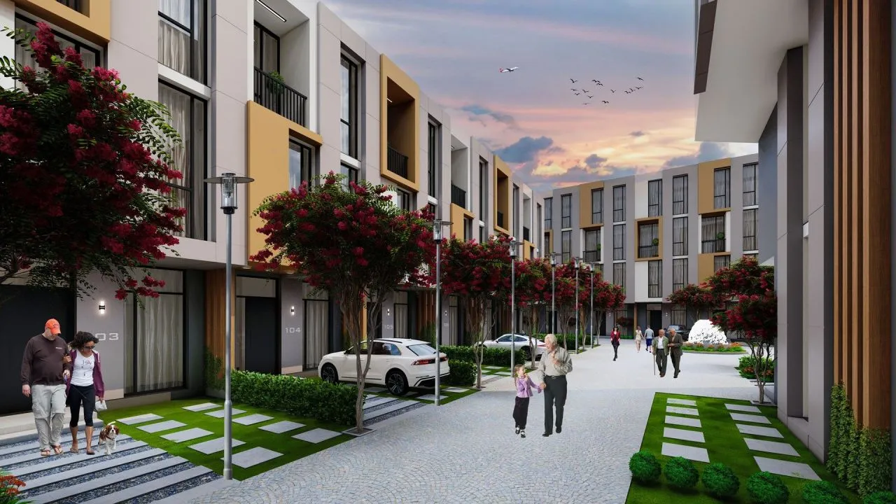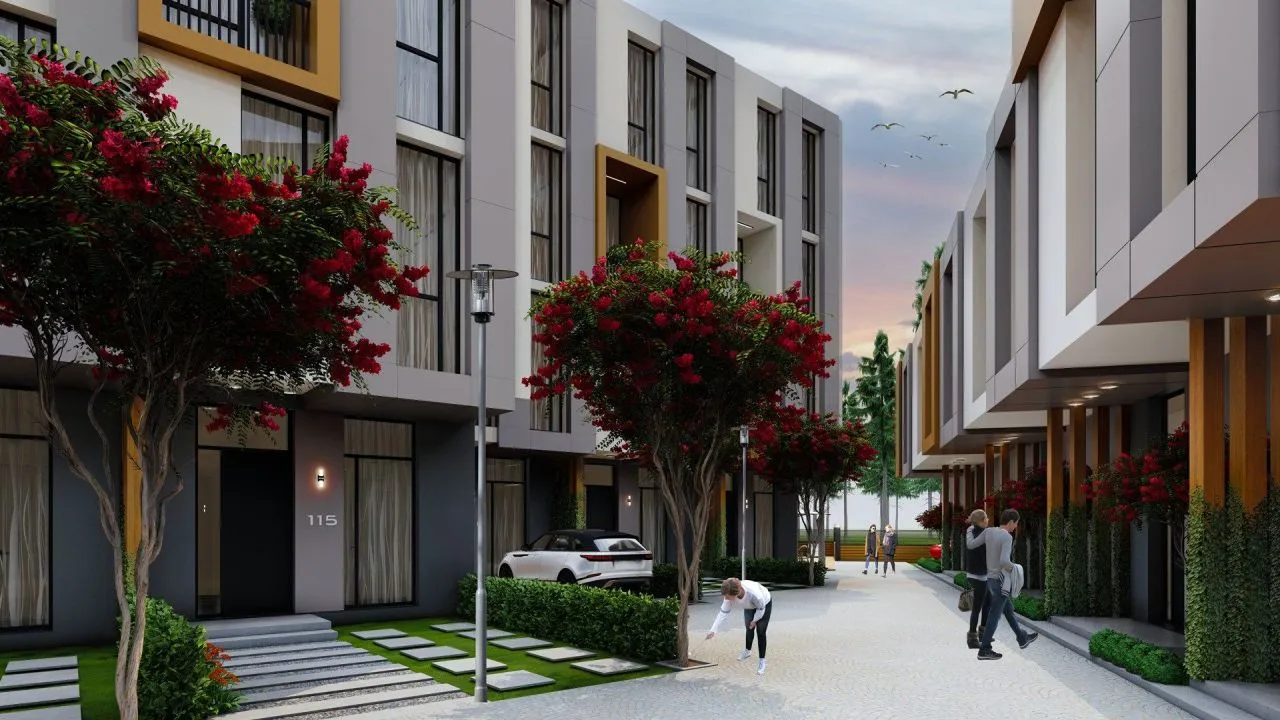 Каждый дом имеет личный сад и место для автомобиля.