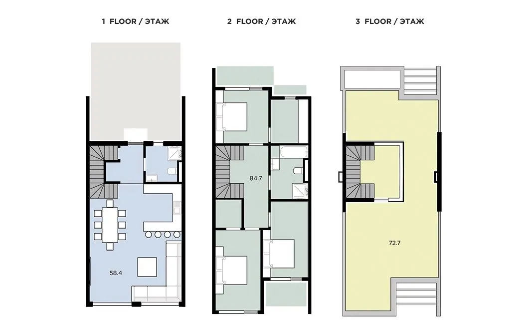 В каждом доме предусмотрена просторная гостиная, совмещенная с обеденной и кухонной зоной, 2 ванные комнаты, 3 уютных спальни (любая из них идеальна для подростков и детей), кабинет, три балкона. У каждого таунхауса есть собственная большая терраса на 3-м уровне, где вы сможете принимать солнечные ванны, заниматься йогой или фитнесом, готовить барбекю или с бокалом аутентичного вина созерцать снежные шапки гор.