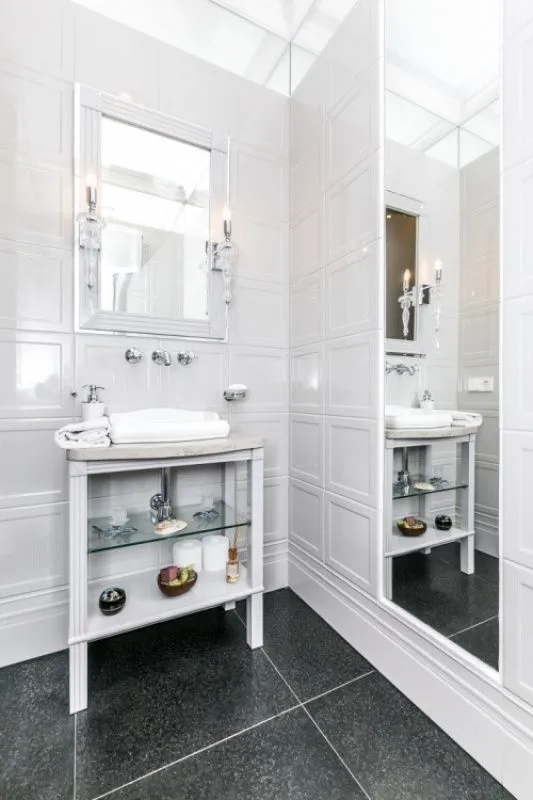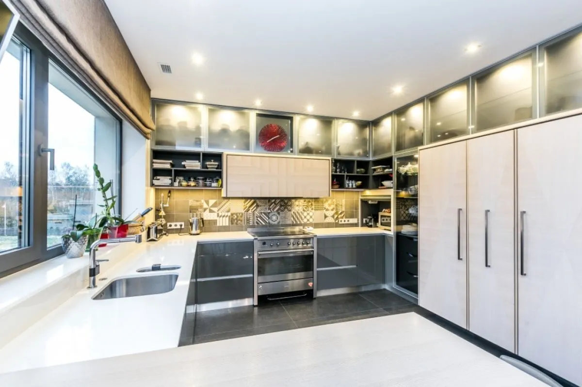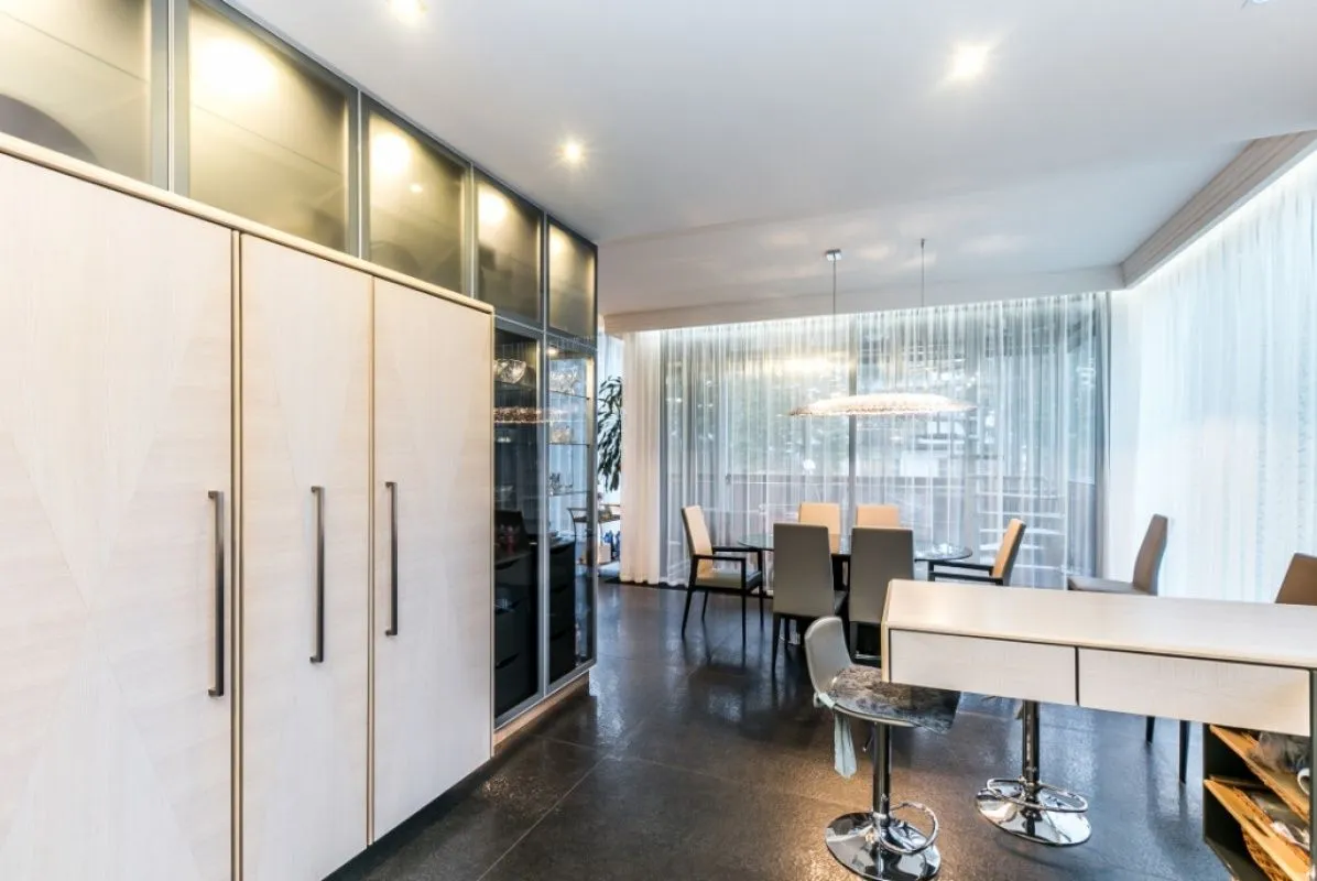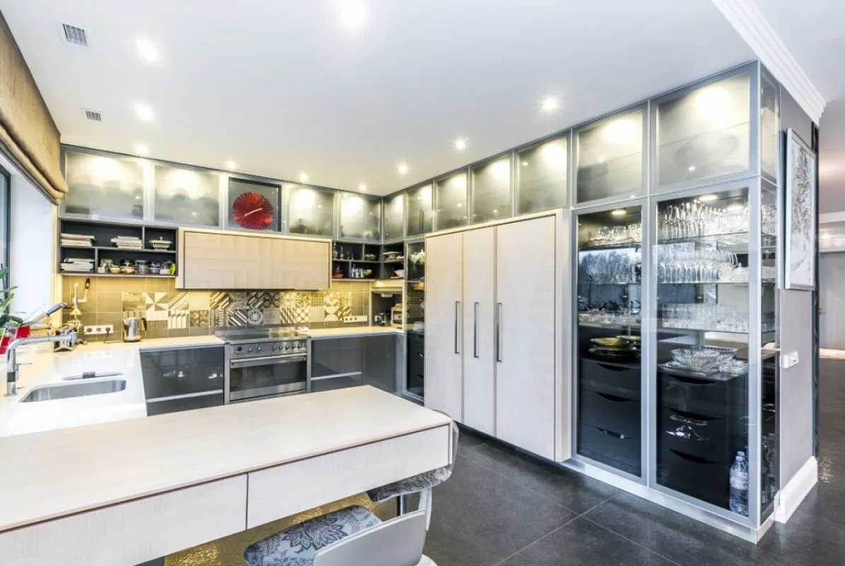 Общая площадь квартиры: 374 кв.м. На первом уровне (191 кв.м.) обустроены: просторная гостиная (площадь 102 кв.м.) с высотой потолка достигающей 4 метра и панорамными окнами до уровня пола, кухня и обеденная зона, гардеробная при входе в квартиру, гостевой санузел, 3 спальных комнаты (1 – master bedroom со своей ванной комнатой и гардеробной, 2 – вторая спальня со своей ванной комнатой), хозяйственное помещение, терраса.