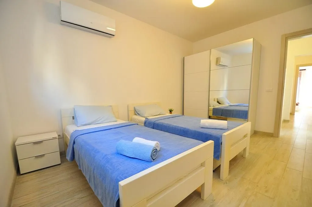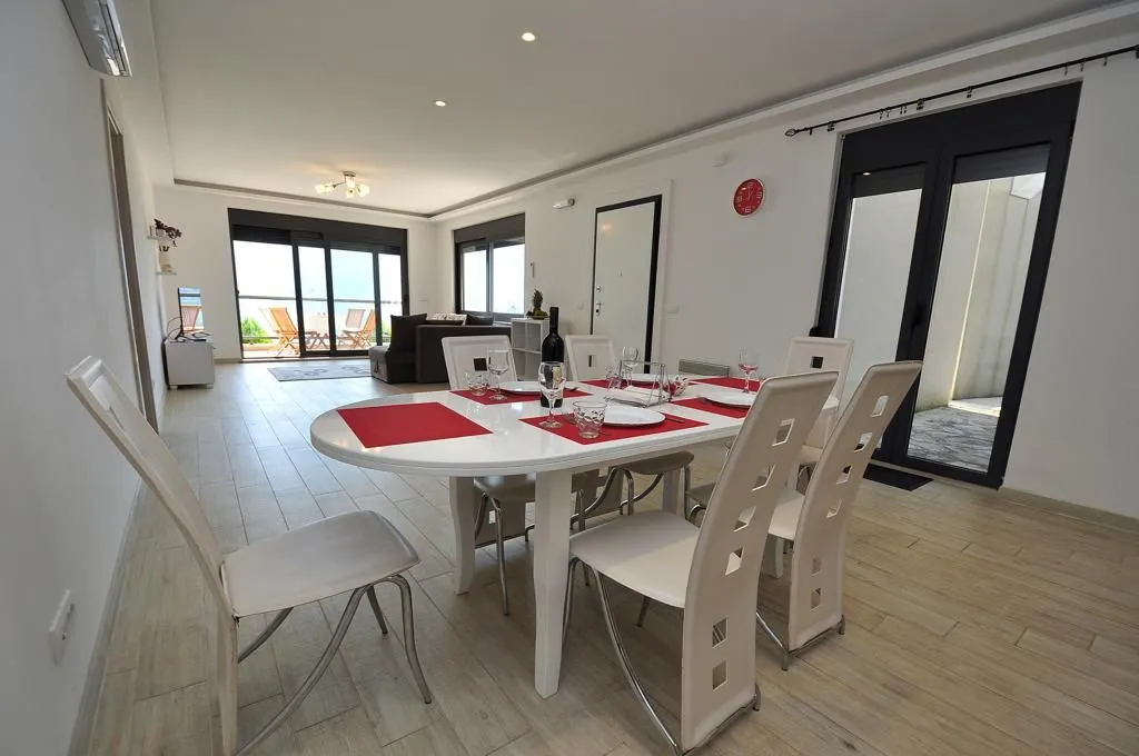 Апартаменты новые, с двумя спальнями, двумя ванными комнатами, гостиной, кухней, столовой, прихожей и террасой с прекрасным видом на море. Перед зданием есть парковочные места для всех арендаторов комплекса.