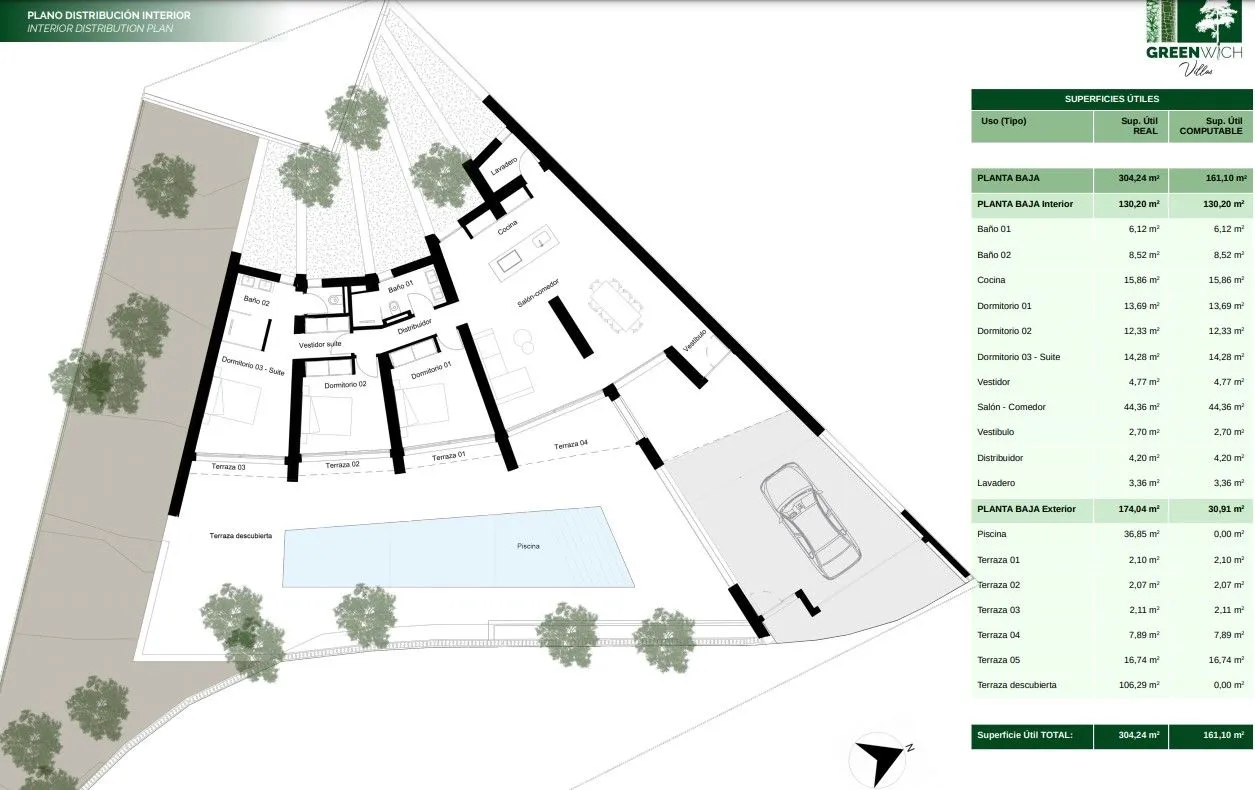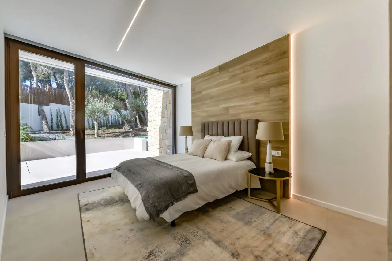 Вилла с эксклюзивным дизайном, общей площадью 196 кв. м. Одноэтажный дом имеет три спальни, две ванные комнаты, просторную гостиную, столовую и открытую кухню, также есть подсобные помещения. Во всем доме установлены большие окна в пол, что дает много света и пространства. На участке, площадью 835 кв. м расположен бассейн, большой сад с плодовыми деревьями и экзотическими растениями, парковка на две машины, зоны отдыха.