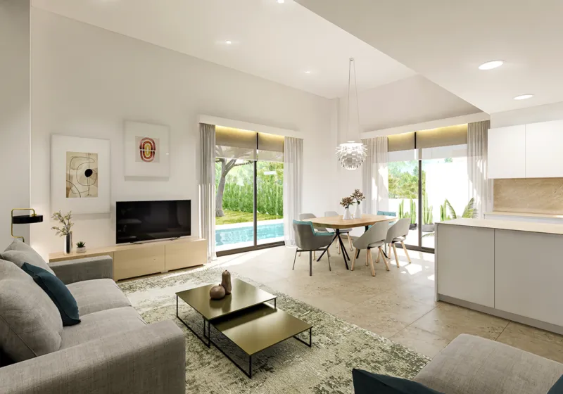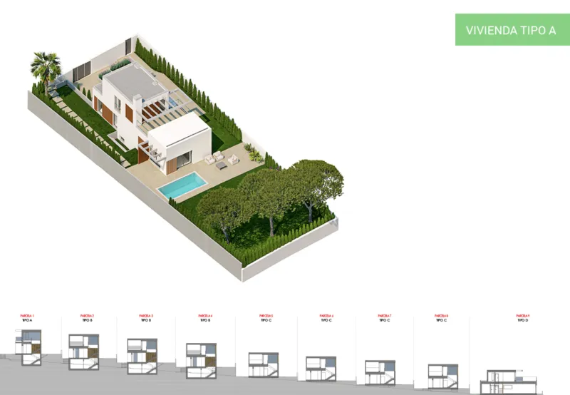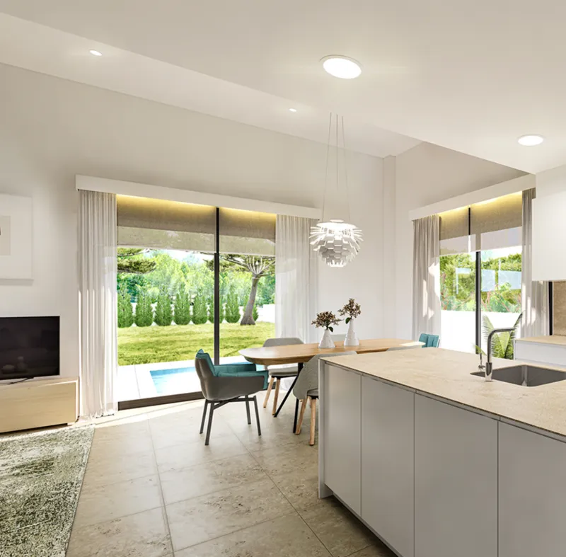 СПЕЦИФИКАЦИЯ: - Алюминиевые двери и окна с двойным остеклением, камерой climalit.- Предварительная установка автоматической входной двери. - Декоративные алюминиевые вертикальные жалюзи на фасаде.- Телекоммуникационная установка для ТВ / FMytelefonia. - Кухонная мебель, состоящая из мебели с матовой отделкой под дерево или ламинатом.- Столешница из SILESTONE. - Бытовая техника: холодильник, индукционная плита, электрическая духовка, вытяжка, встроенная посудомоечная машина и микроволновая печь.- Моторизованные жалюзи в спальнях.- Электрический теплый пол с термостатом в ванных комнатах.- Гладкие складные межкомнатные двери, окрашенные в белый матовый цвет.- Шкафы с распашными дверцами, обшитые внутри меламиновой доской, со штангой, ящиками и полками.- Хромированные смесители в раковинах и душевых.- Оборудование для фильтрации и очистки бассейна.- Внутреннее освещение дома оснащено точечными светильниками в подвесных потолках.- Сад с различными фруктовыми деревьями, растениями, природный газон и/или декоративный гравий.
