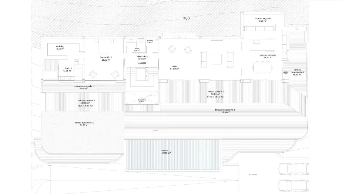 Вилла в три этажа, имеет шесть спален, шесть ванных комнат, множество террас, бассейн 50 кв.м., тренажерный зал 60 кв.м., подземный гараж на три авто. Главная спальня оборудована просторной гардеробной комнатой, в остальных спальнях есть встроенные шкафы. Из гостиной есть выходы на просторную террасу с видом на море, а также к бассейну и зоне барбекю. Дом оснащен предустановкой системы кондиционирования, также имеет теплый пол во всем доме и лифт.
