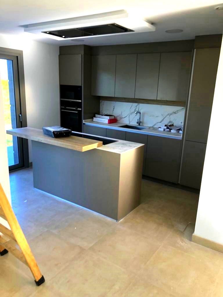 Меблированная кухня с гранитной столешницей, индукционной плитой, духовкой из нержавеющей стали, холодильником, вытяжкой, миксером, а также выходом и сливом для посудомоечной машины.