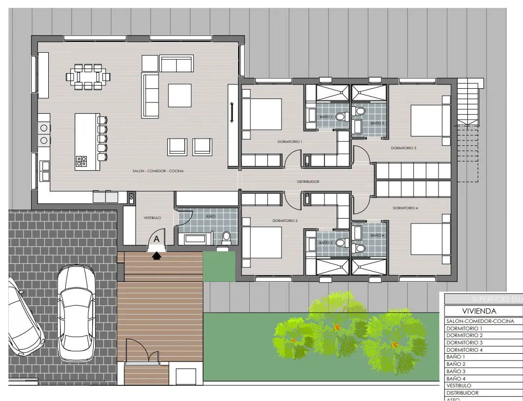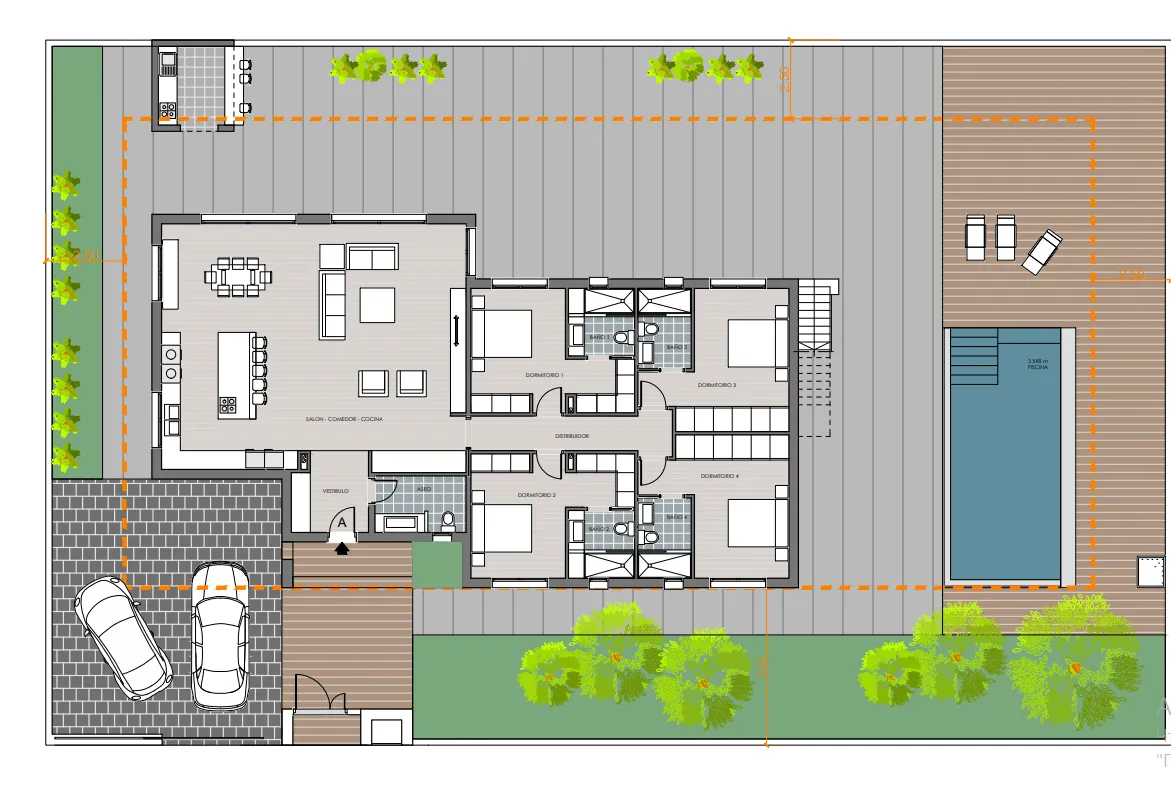 Одноэтажная вилла площадью 200 кв. м., имеет четыре спальни, четыре ванные комнаты, гостиную совмещенную с кухней и солярий (большая терраса на крыше, где можно загорать, оборудовать зону отдыха). Подвал по желанию.