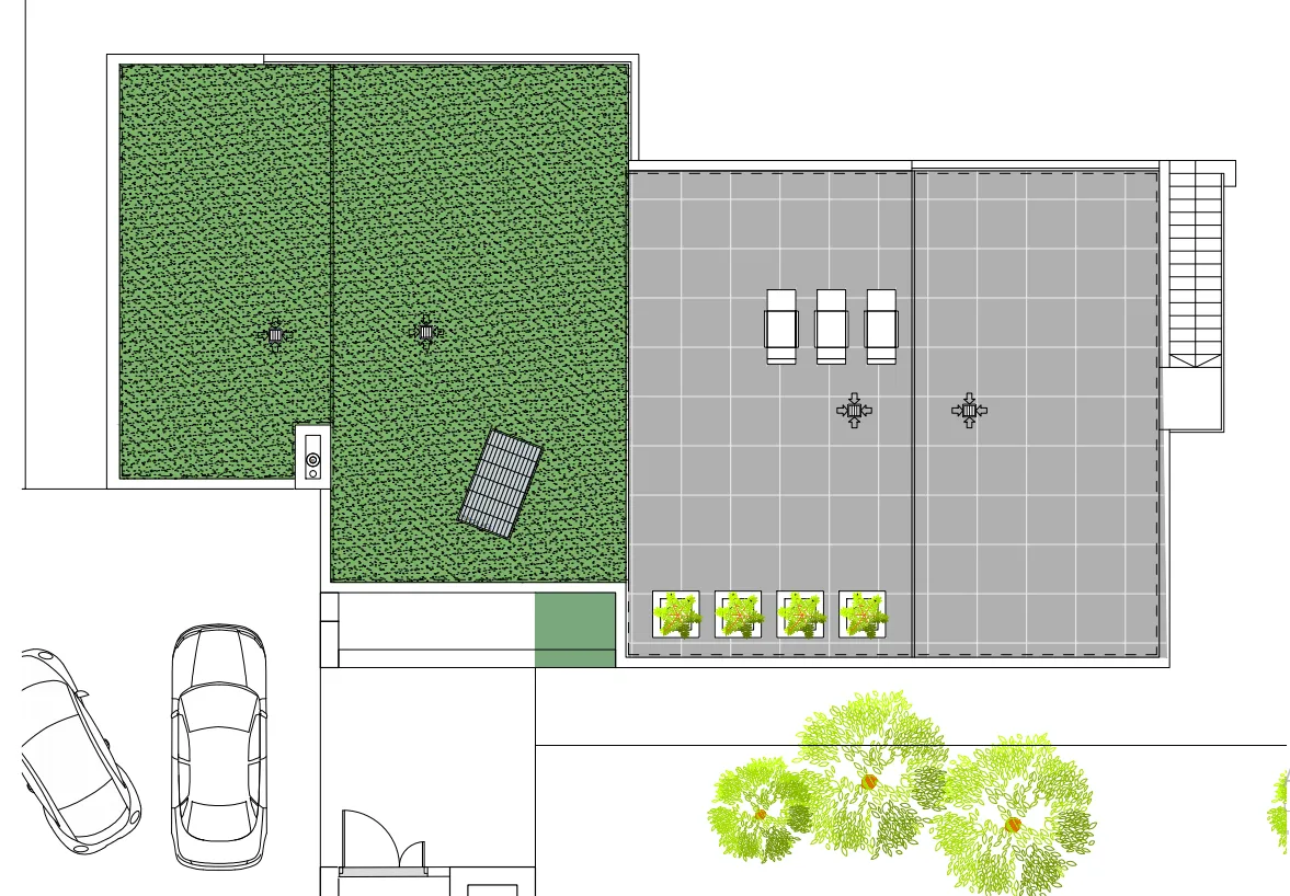Вилла с собственным участком площадью 800 кв. м., с бассейном, зоной отдыха, парковкой, садом и барбекю.