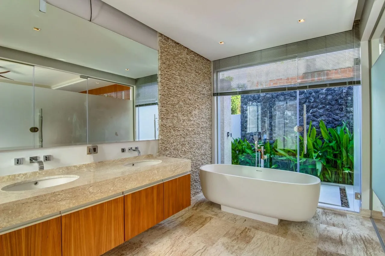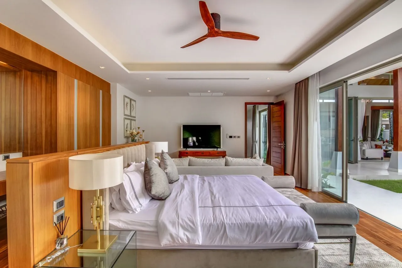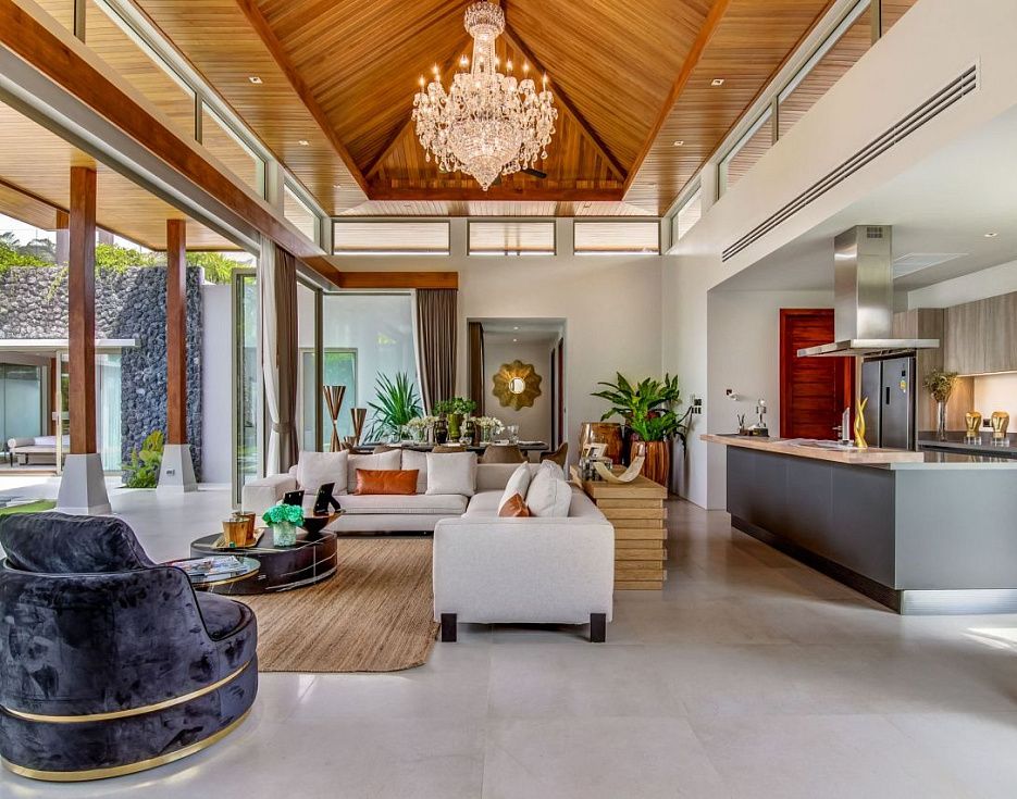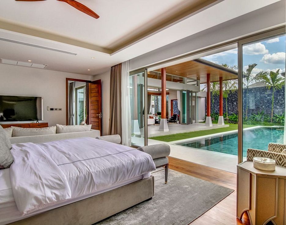 Потолки спален, выполненные из тикового дерева, удачно сочетаются с нейтральной плиткой, а предметы декора – притягивают взгляд и расставляют акценты. Ощущение теплой, манящей атмосферы присутствует с первого момента пребывания на этой вилле.Роскошный деревянный пол и тиковые балки, уходящие в подвесные потолки, делают пространство теплым и манящим, а стеклянные раздвижные двери – перегородки наполняют помещение светом, здесь хочется дышать полной грудью.