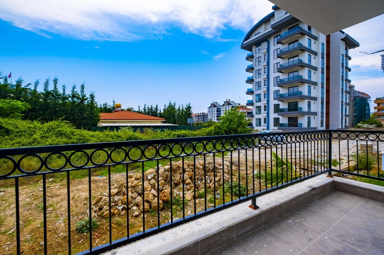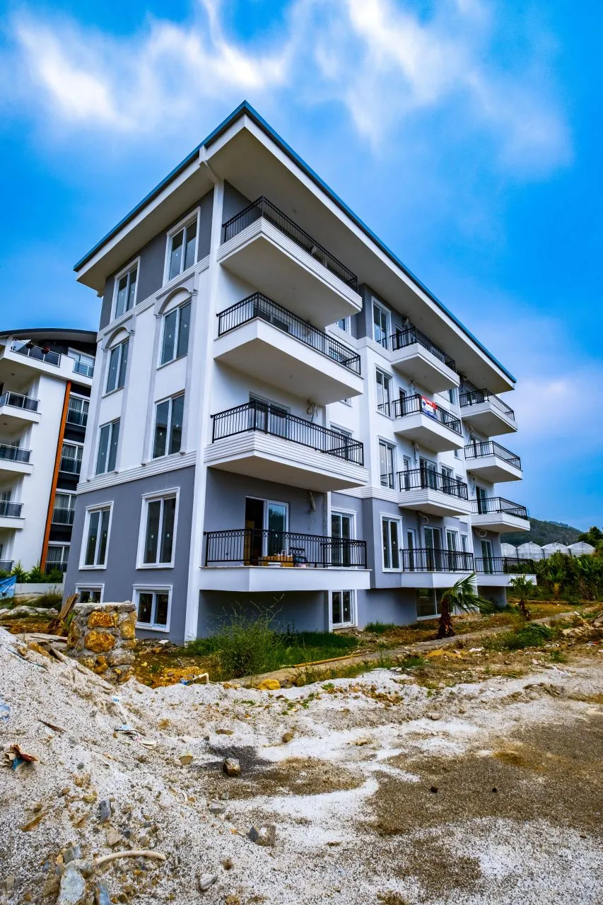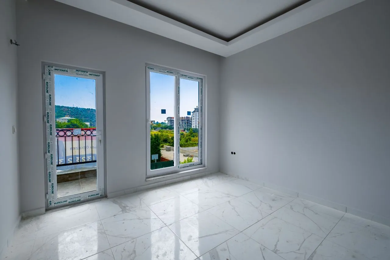 Наша квартира 1+1 находится в уютной пятиэтажной новостройке на третьем этаже. Окна выходят на Юг. Вокруг довольно много зеленых насаждений. Планировка квартиры включает гостиную с открытой кухней, спальную комнату и санузел. В квартире очень много света за счет количества окон. Из гостиной и спальни есть выход на балкон. В доме есть бассейн. Расстояние до моря всего 700 метров.