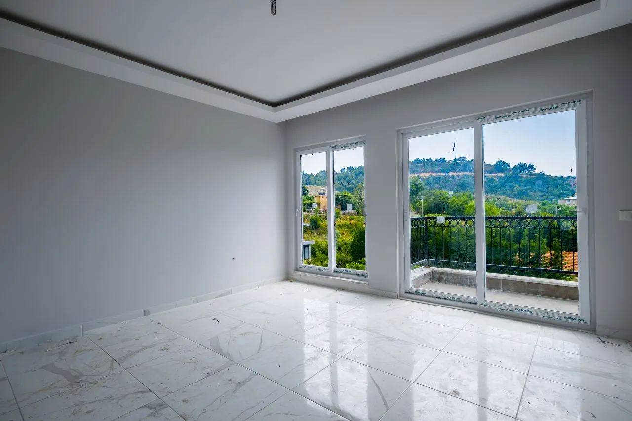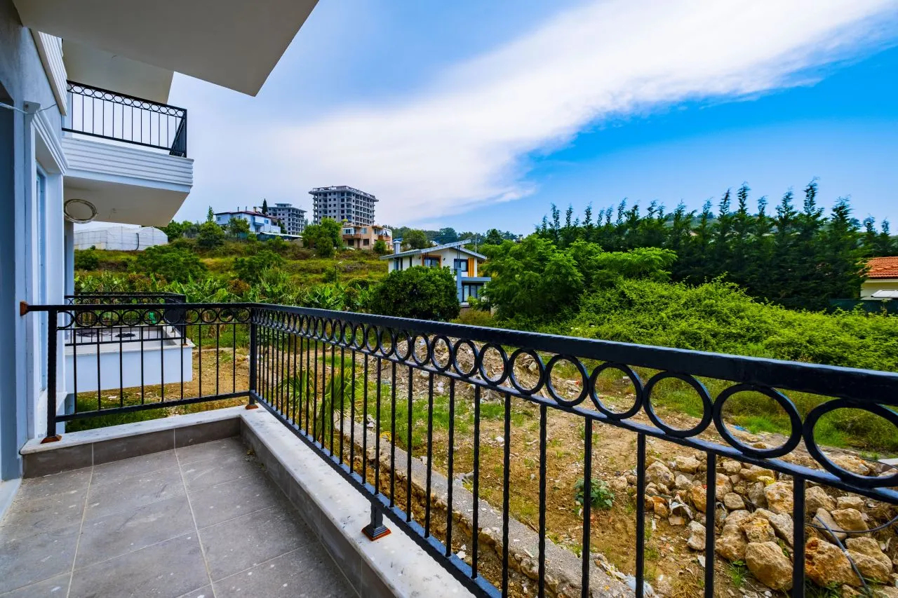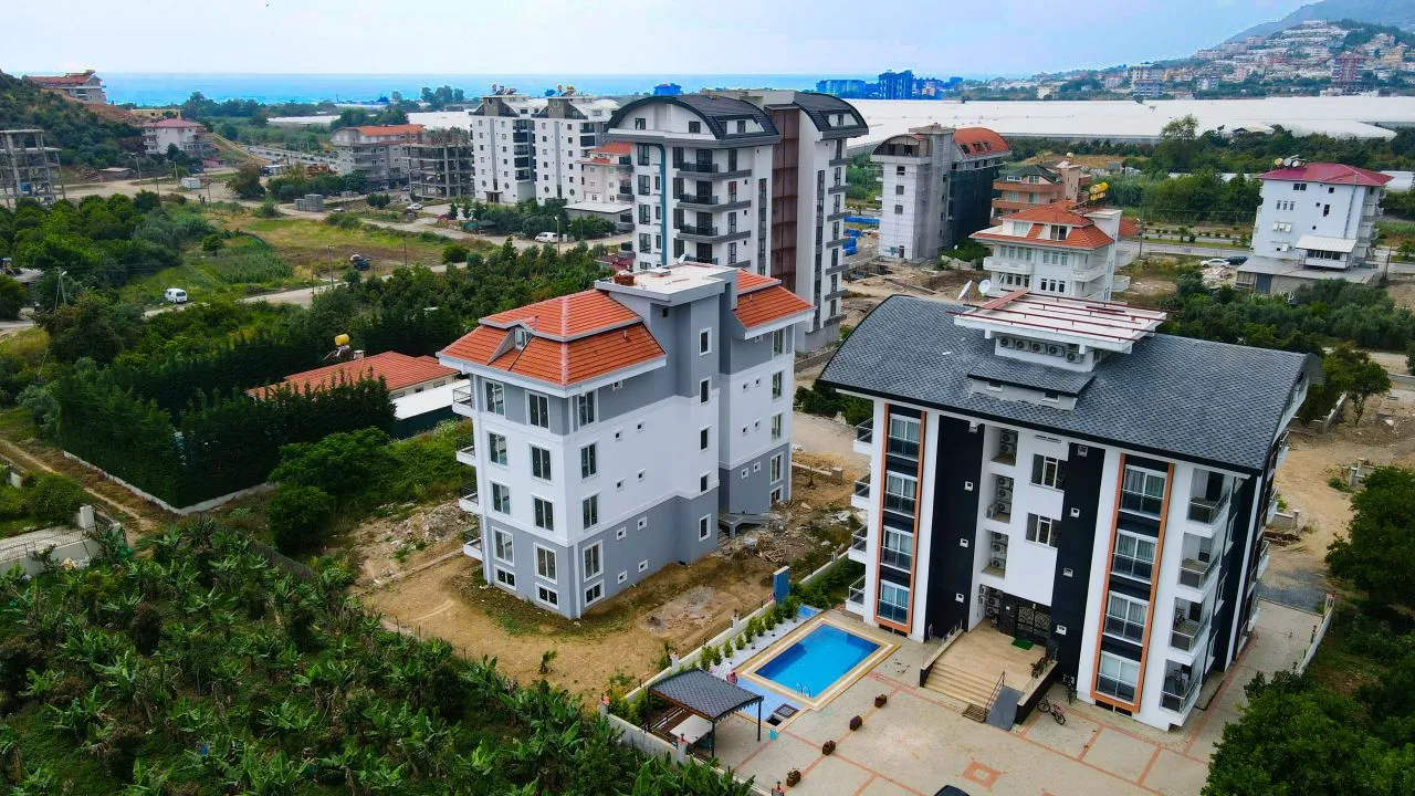 Наша квартира 1+1 находится в уютной пятиэтажной новостройке на третьем этаже. Окна выходят на Юг. Вокруг довольно много зеленых насаждений. Планировка квартиры включает гостиную с открытой кухней, спальную комнату и санузел. В квартире очень много света за счет количества окон. Из гостиной и спальни есть выход на балкон. В доме есть бассейн. Расстояние до моря всего 700 метров.