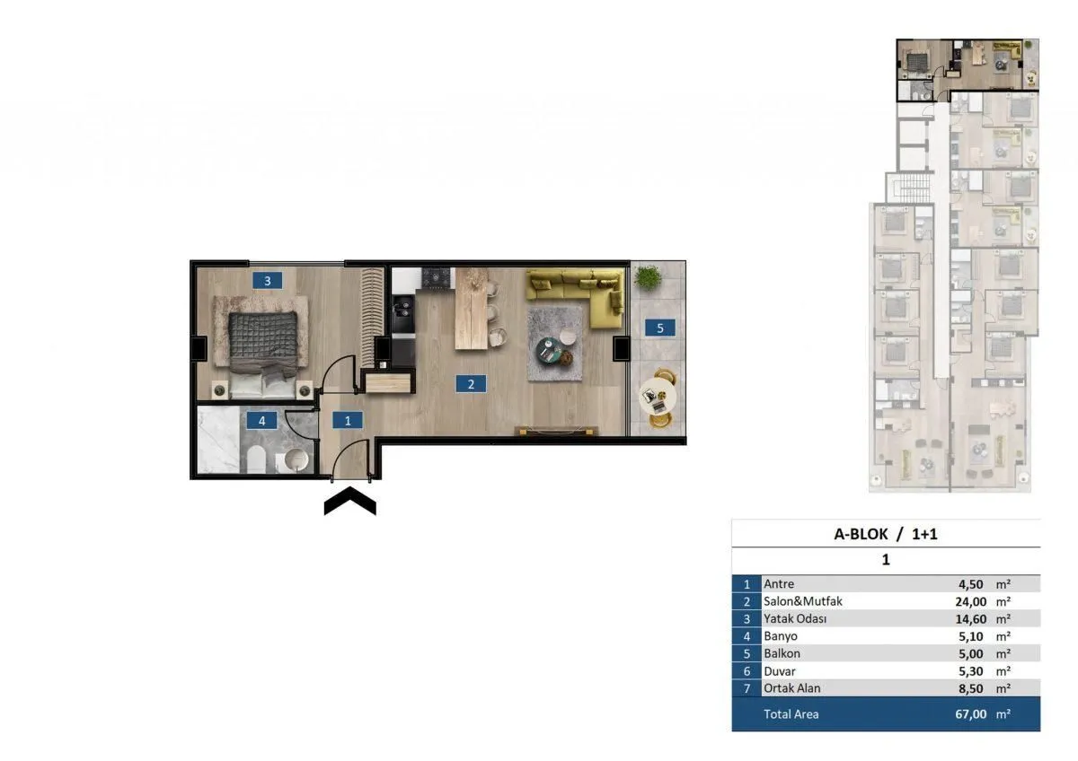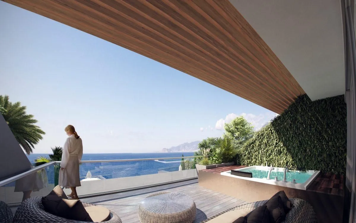 Квартиры В ЖК продаются апартаменты площадью от 65-322 м2 Варианты планировки: 1+1: гостиная, совмещенная с кухней, спальная комната, ванная и балкон. 2+1: гостиная, совмещенная с кухней, две спальни, две ванных, балкон. 3+1: гостиная, совмещенная с кухней, три спальни, две ванных, сауна, балкон 4+1: гостиная, совмещенная с кухней, четыре спальни, две ванных, балкон Есть варианты планировки с джакузи на балконе Дуплексы: 3+1: гостиная с кухонной зоной, три спальни, 3-4 ванных, 2 балкона, джакузи 4+1: гостиная, совмещенная с кухней, четыре спальни, 4 ванных, хамам или сауна, 2 балкона. В стоимость квартир входит чистовая отделка: керамическая плитка высшего качества на полах, основная и декоративная системы освещения, кухонный гарнитур с гранитной рабочей поверхностью, встроенный гардероб, стальная входная дверь, двойные алюминиевые стеклопакеты, полностью укомплектованные ванные комнаты, кондиционеры и др. Из здания будет открываться прямой вид на море, а так же вид на горы, природу, бассейн и город.