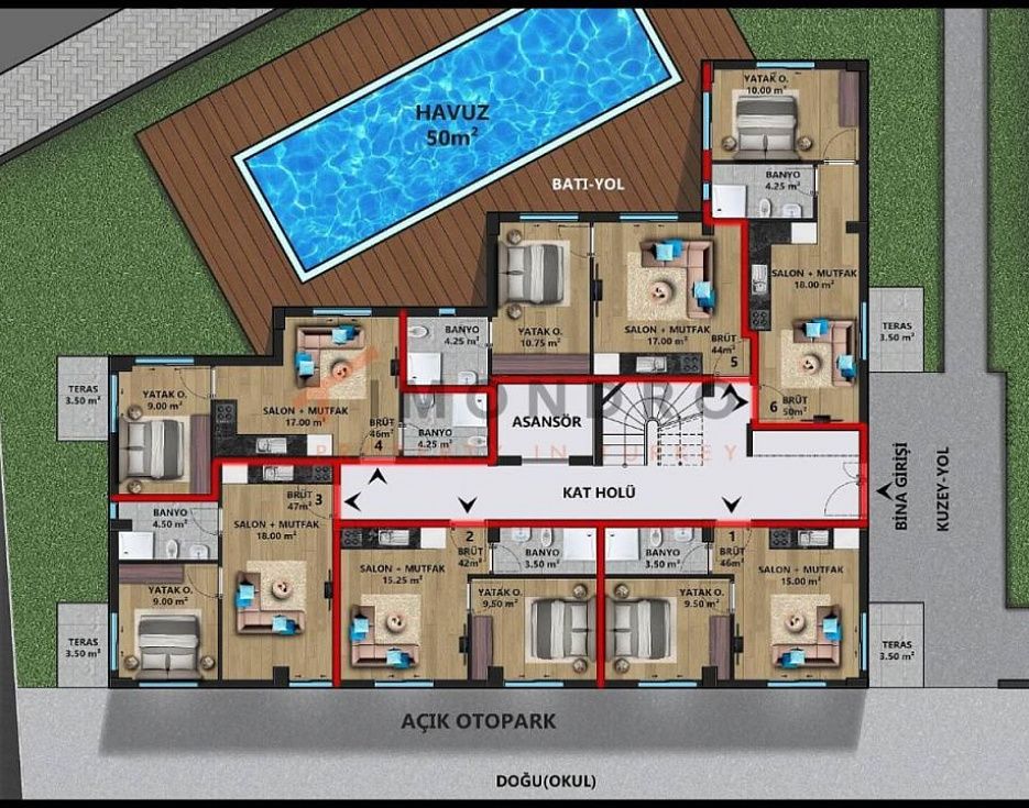 Квадратные метры недвижимости на продажу в Турции обычно указываются в соответствии с английскими/американскими стандартами. Чистый квадратный метр не включает, например, балкон. Пожалуйста, вычтите примерно от 10 до 15 %.