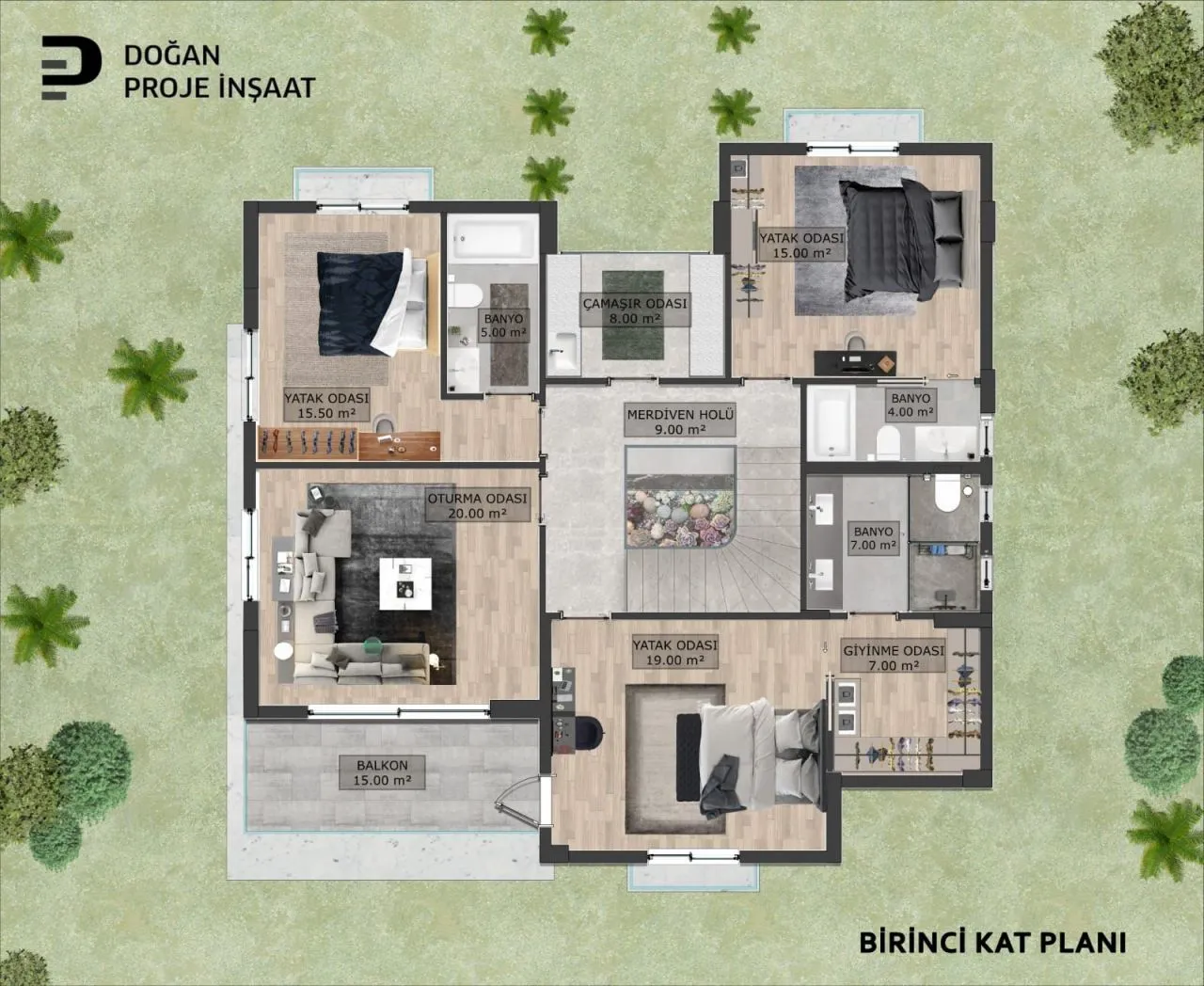 Проект вилл располагается в тихом и спокойном месте в районе Дёшемэалты г. Анталья, в 5 минутах от Университета Анталии Билим и Топлум Коледжи. Проект состоит из 6 блоков, в которых расположились 12 вилл. Каждая вилла планировки 5+1, общей площадью 340 м2, с собственным бассейном.