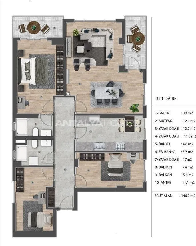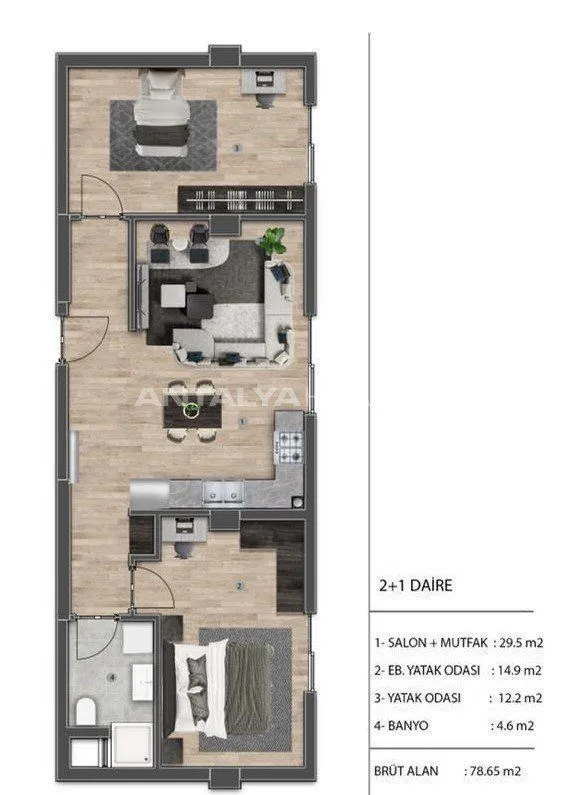 Квартиры с 2 или 3 спальнями состоят из гостиной, кухни открытой планировки или отдельной кухни, 1 или 2 ванных комнат, 1 или 2 балконов. Стильные квартиры оборудованы кухонной техникой, газопроводом и системой отопления, центральной системой спутникового телевидения, входной металлической дверью.