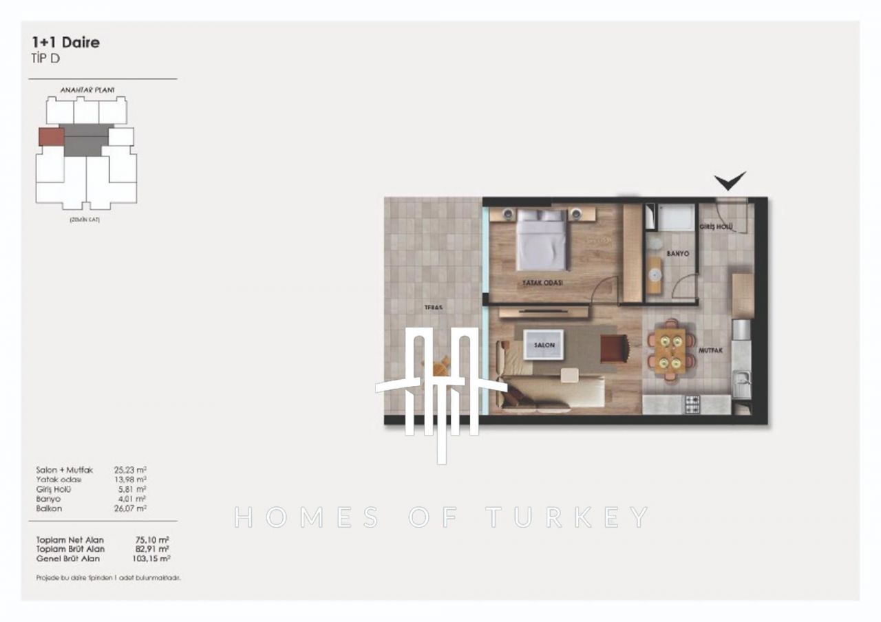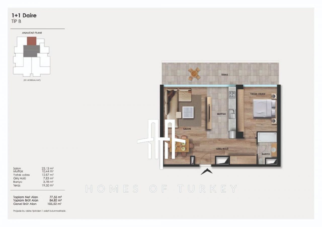 The project has an area of 6000 square meters and consists of 1+1, 2+1 and 3+1 flat types. There are 54 residences, 7 villas, 41 office areas and 5 commercial areas. All residences have balconies and terraces. There are walking track, green landscape, gym, Turkish bath, steam room, terrace, cafe, swimming pool, security and 24/7 security camera social facilities in the site.