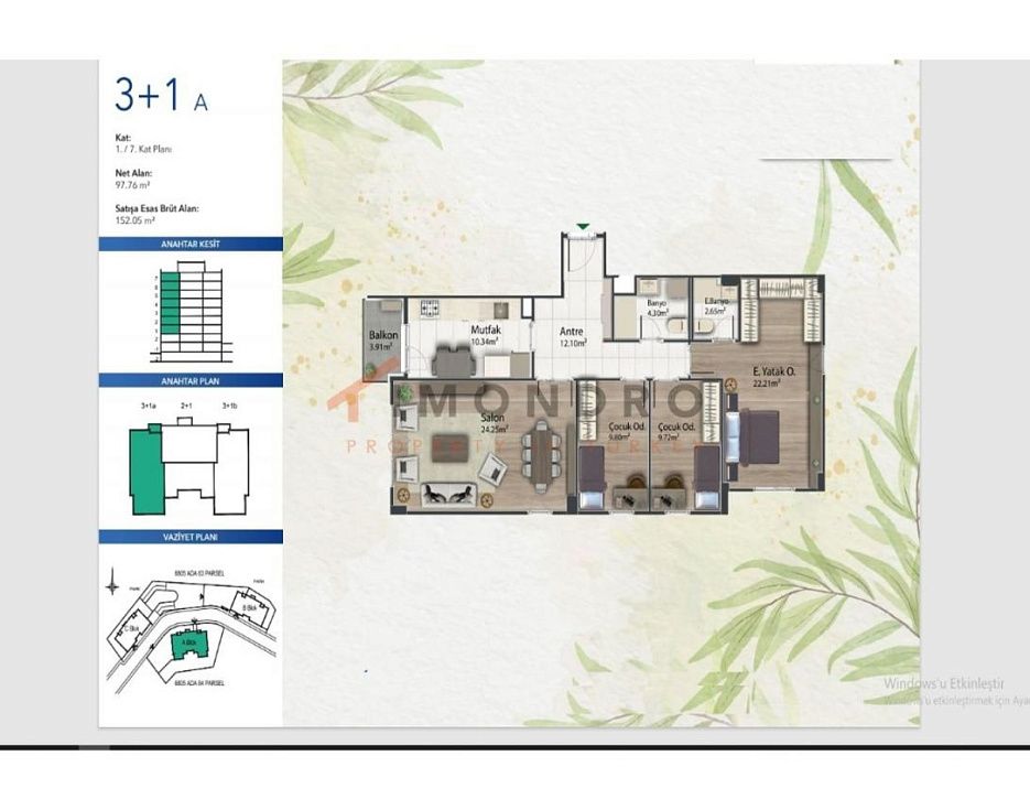 Квадратные метры недвижимости на продажу в Турции обычно указываются в соответствии с английскими/американскими стандартами. Чистый квадратный метр не включает, например, балкон. Пожалуйста, вычтите примерно от 10 до 15 %.