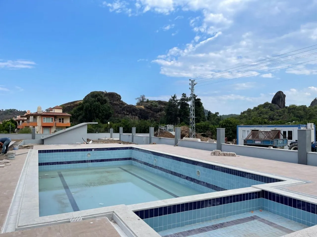- На территории будет бассейн для взрослых и детей 6x12 м, а также душевые и зоны для отдыха, крытая беседка и площадка для барбекю.