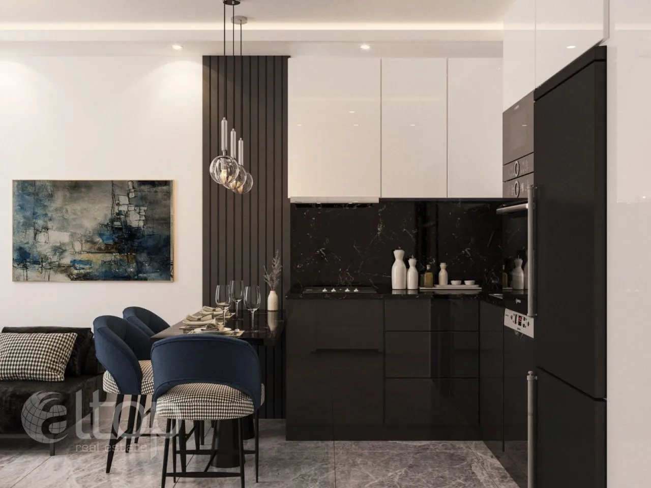 Практически из всех квартир открывается красивый вид на море и горы. Квартиры продаются в чистовой отделке, с встроенным кухонным гарнитуром и оборудованными ванными комнатами.
