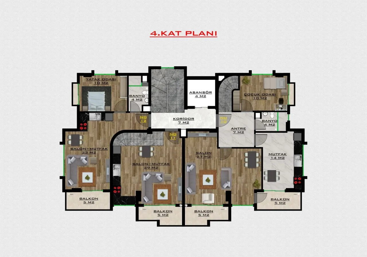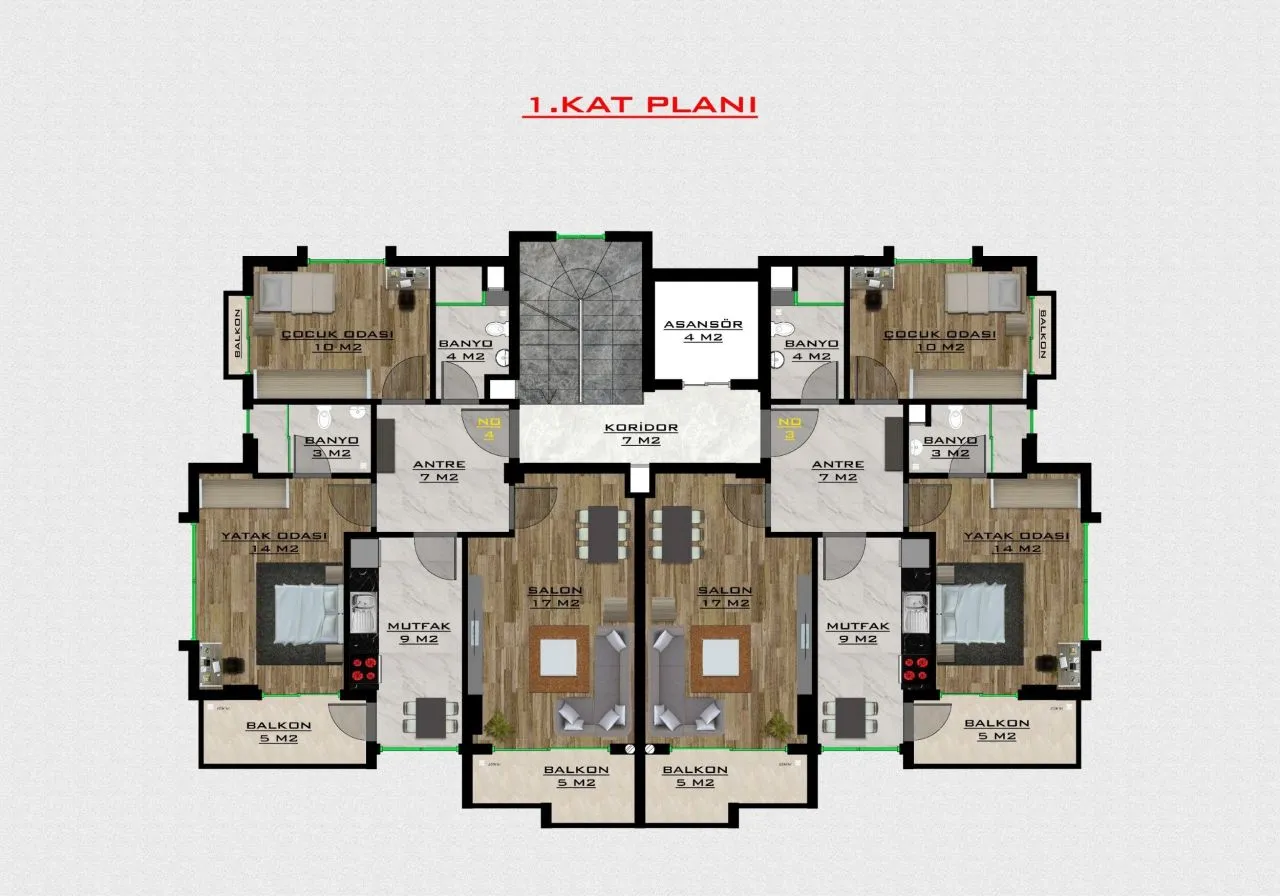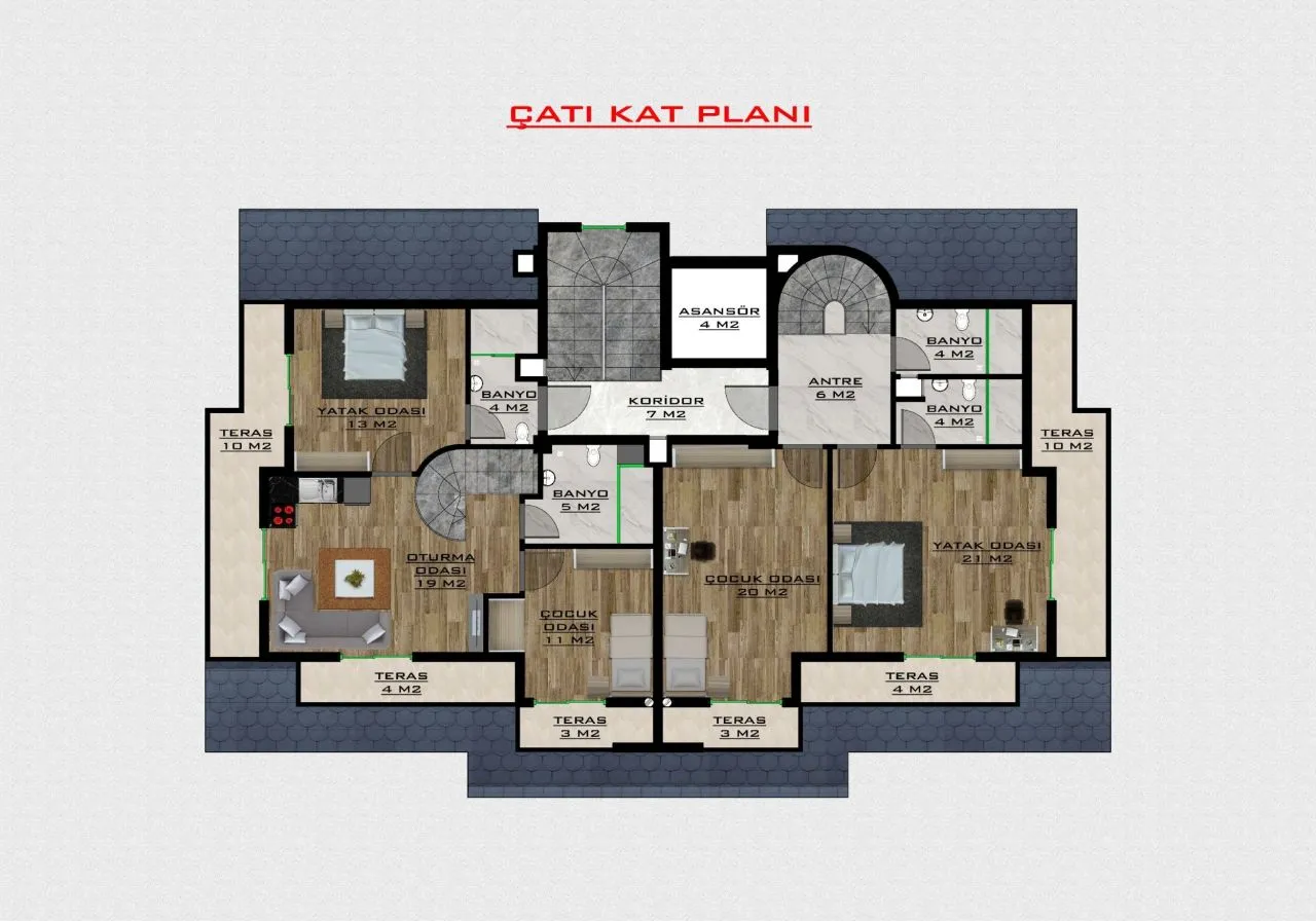 и дуплексы планировки 3+1 – три спальни и гостиная, которая совмещена с кухней, две ванных комнаты, и три балкона. (площадь 118 м2)