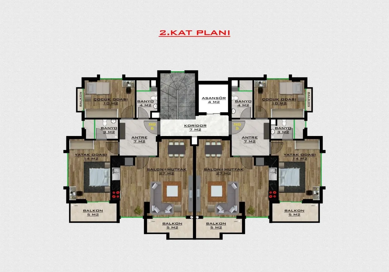 2+1 – две спальни и гостиная, которая совмещена с кухней, две ванных комнаты, и два балкона; (площадь 87 м2)