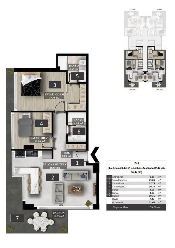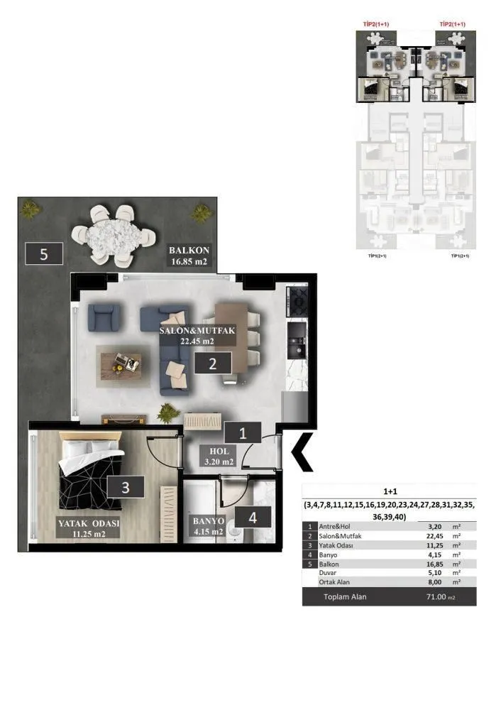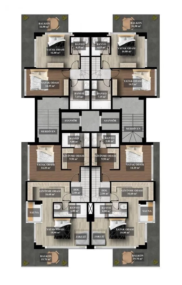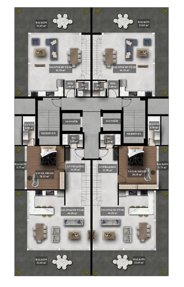 Квартиры В ЖК продаются апартаменты площадью от 70 до 210 кв.м. Варианты планировки: 1+1: гостиная, совмещенная с кухней, спальня, ванная и балкон. Площадь 70-71 кв.м. 2+1: гостиная, совмещенная с кухней, две спальни, две ванных, балкон. Площадь 109 кв.м Дуплексы: 2+1: гостиная, совмещенная с кухней, две спальни, три санузла, 2 балкона. Площадь 150 кв.м. 3+1: гостиная, совмещенная с кухней, три спальни, три санузла, сауна, джакузи, 2 балкона. Площадь 210 кв.м. В стоимость квартир входит чистовая отделка, кухонный гарнитур с гранитной рабочей поверхностью, полностью оформленные санузлы, входные и межкомнатные двери, точечное освещение и многое другое. Из окон будет открываться вид на море, горы, бассейн и город.