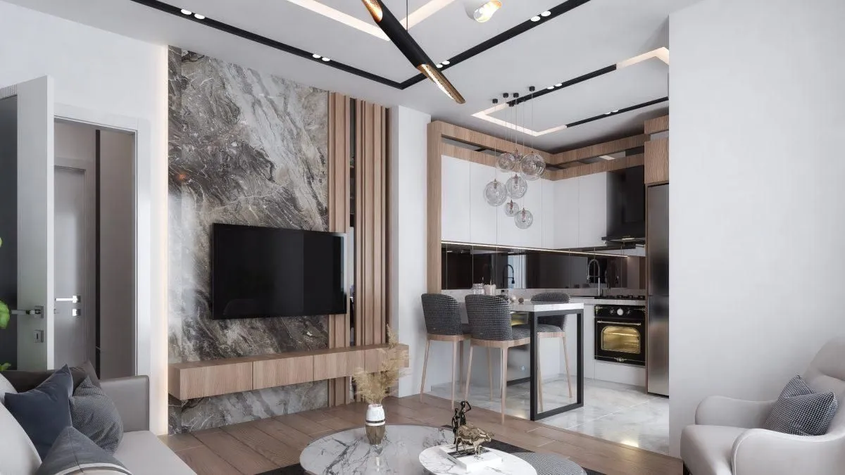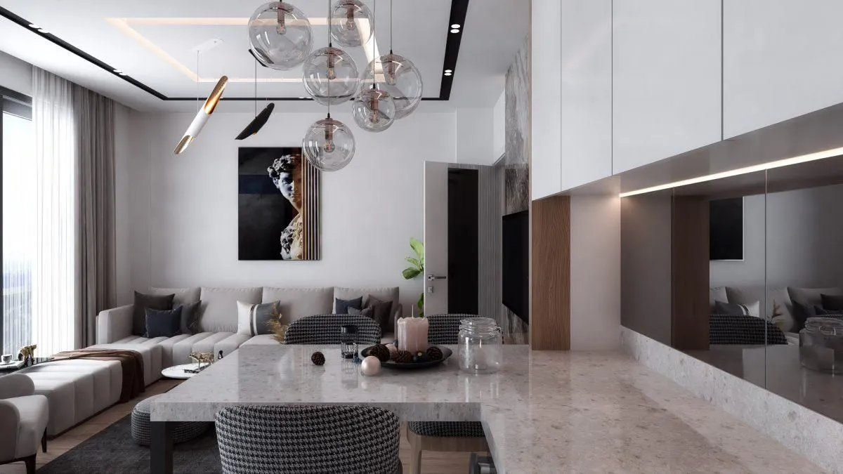 2+1: гостиная, совмещенная с кухней, две спальни, ванная и балкон. Площадь 73 кв.м.