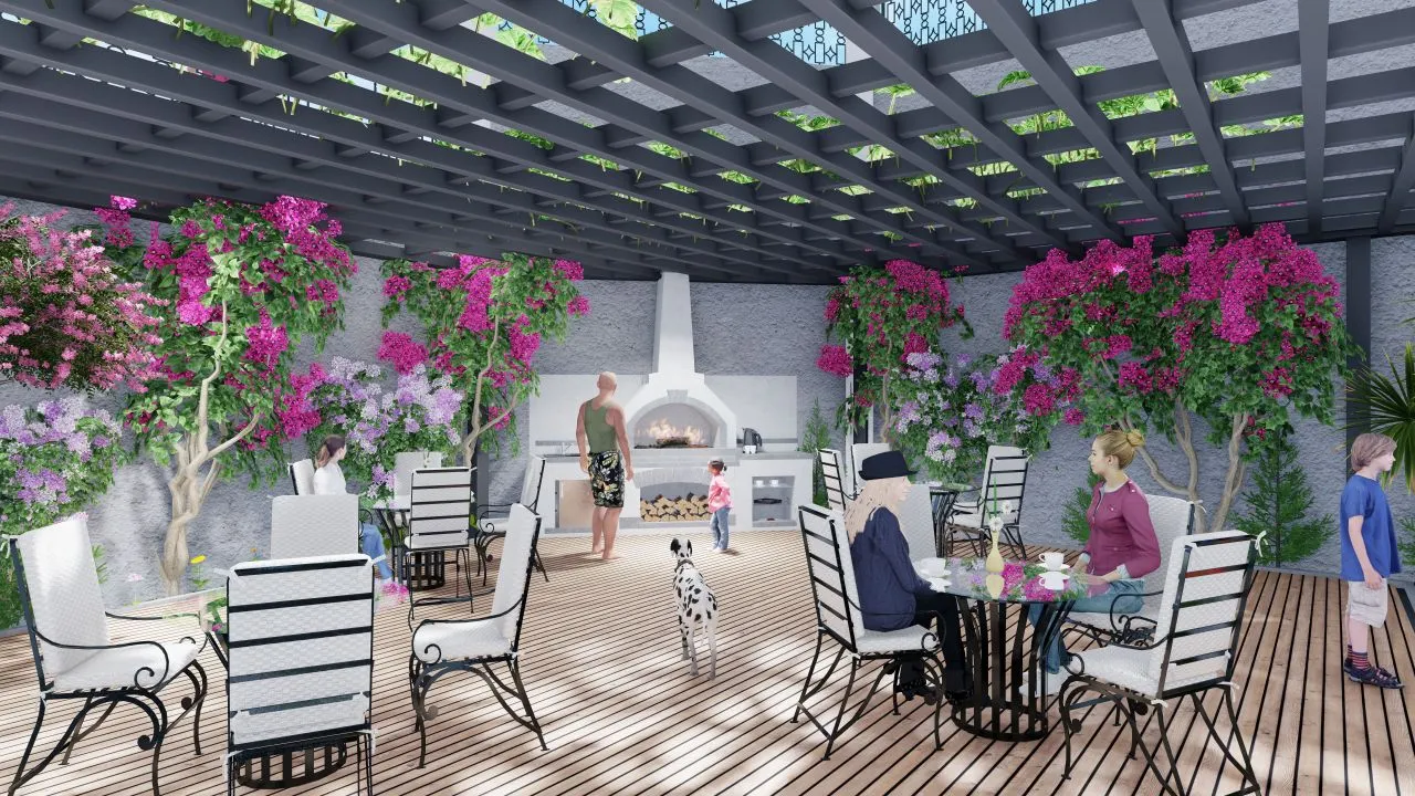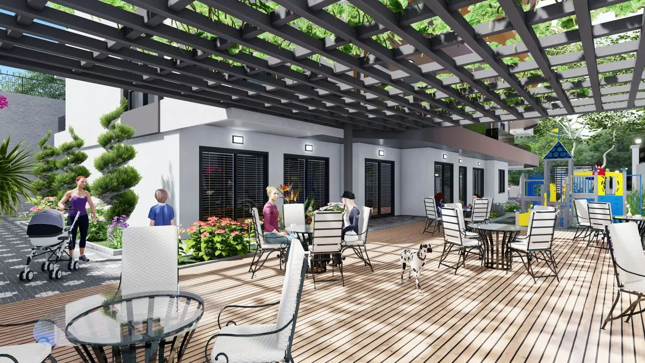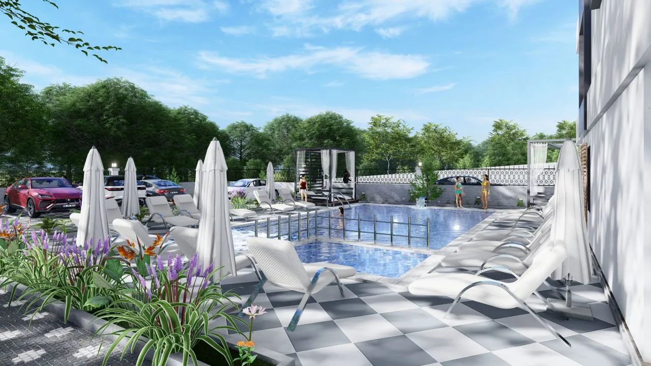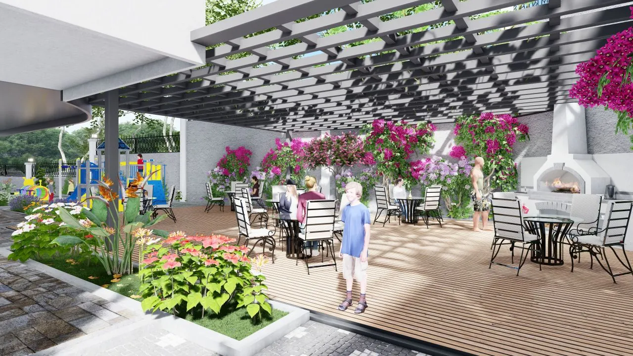 автостоянка, теннисный стол, детская площадка, конференц-зал, генератор, фитнес, зона барбекю и бассейн.
