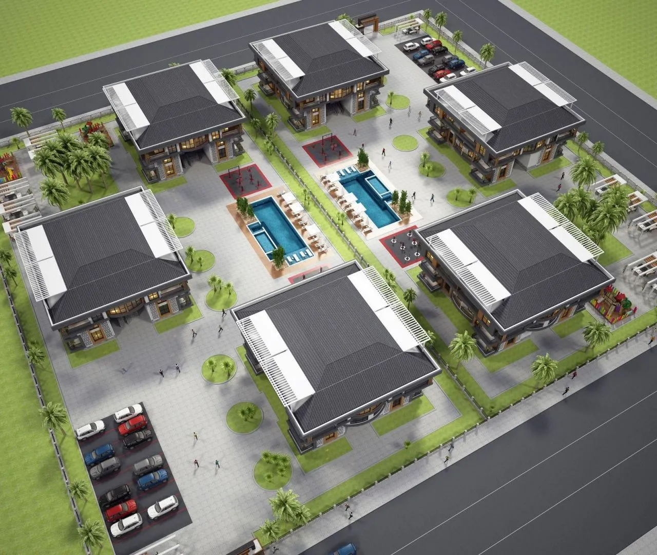 Комплекс в окружении оливковых деревьев.