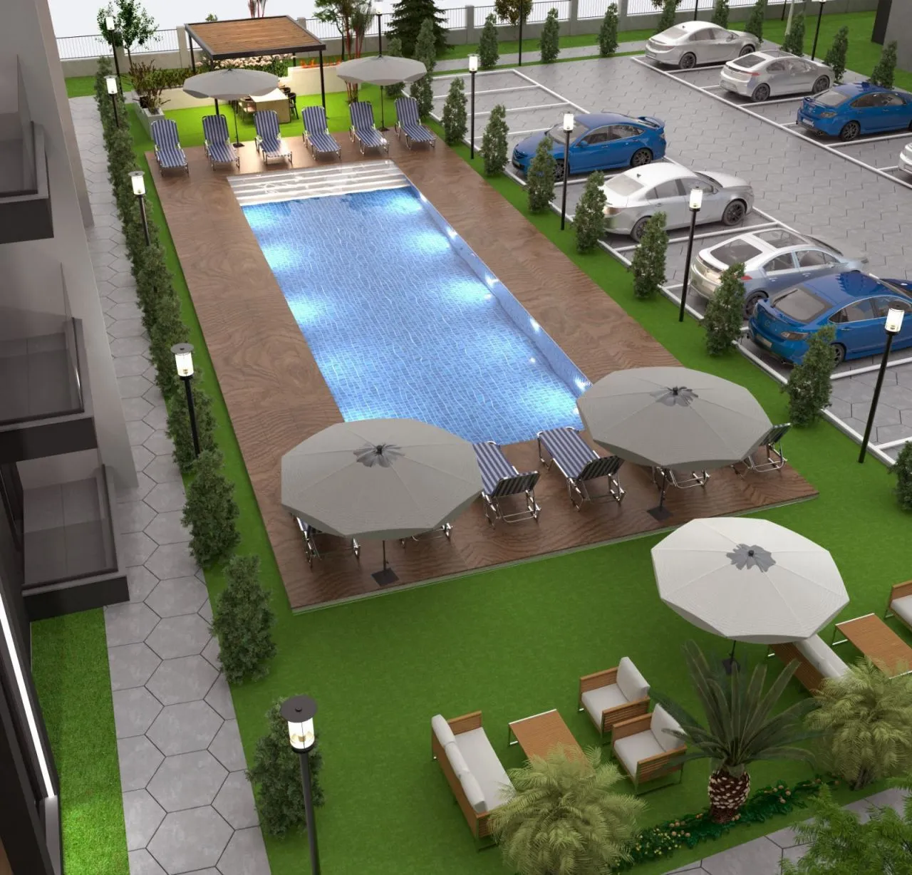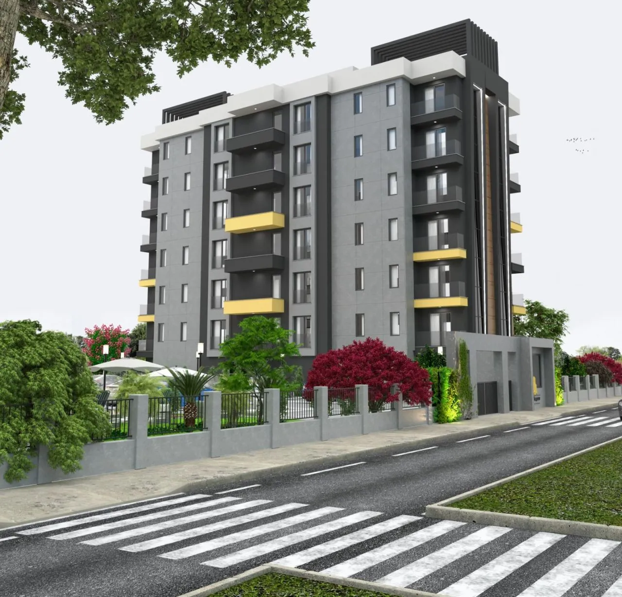 Общая площадь 50 м2.Квартиры будут сдаваться в чистовой отделке: встроенный шкаф в прихожей, видеодомофон, точечное освещение во всей квартире, ламинированные высококачественные двери, встроенная мебель в ванной и вся сантехника, корпусная кухонная мебель.В комплексе будут расположены открытый плавательный бассейн, зона для загара и отдыха, фитнес-зал, детская площадка, зона барбекю, охраняемая огороженная территория с парковкой, система охранного видеонаблюдения. Комплекс будет оборудован лифтом.