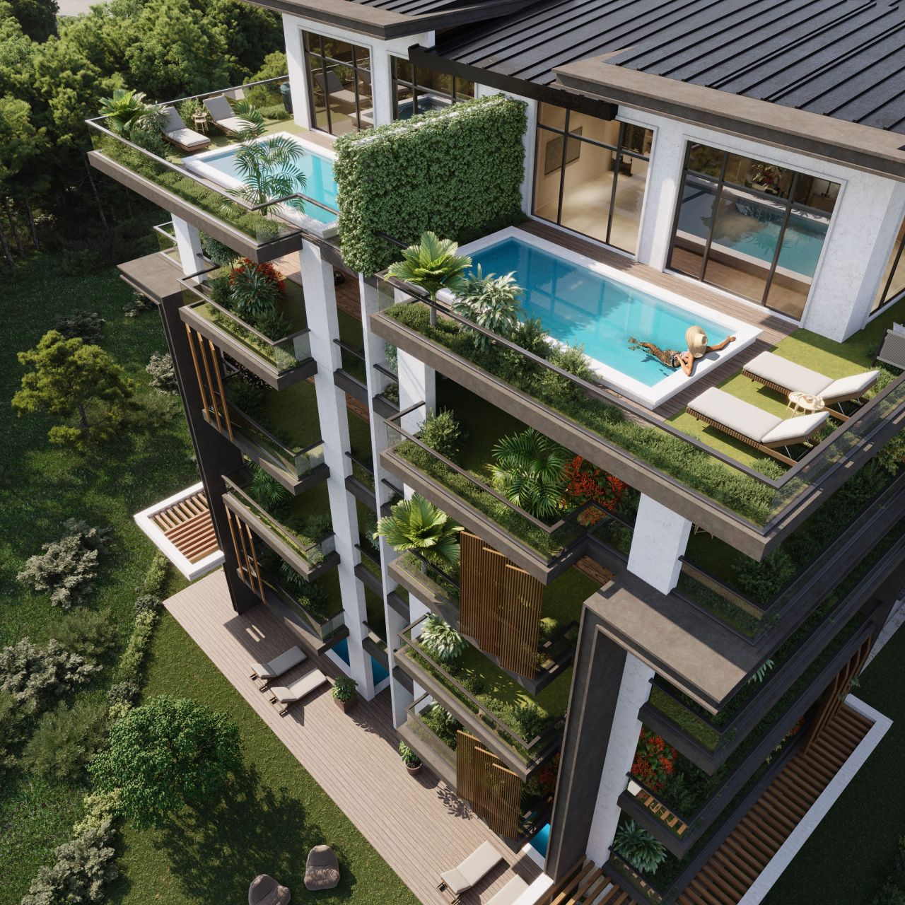 Кроме того, блоки G и H специально спроектированы, предлагая варианты квартир с собственными садами и бассейнами для более роскошного образа жизни.