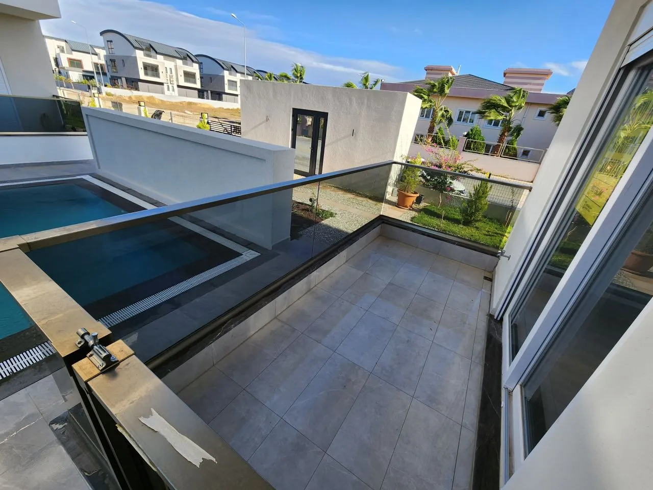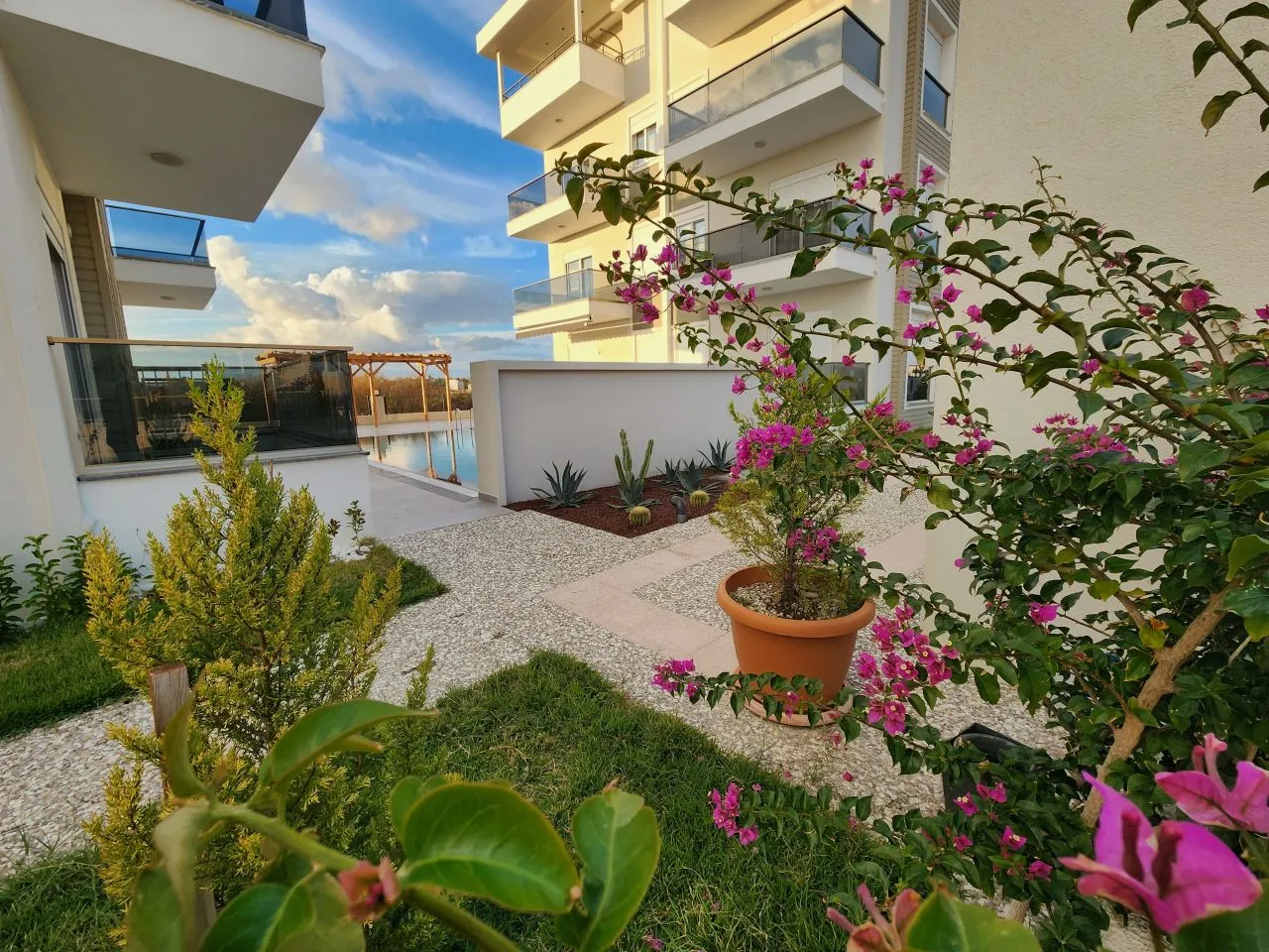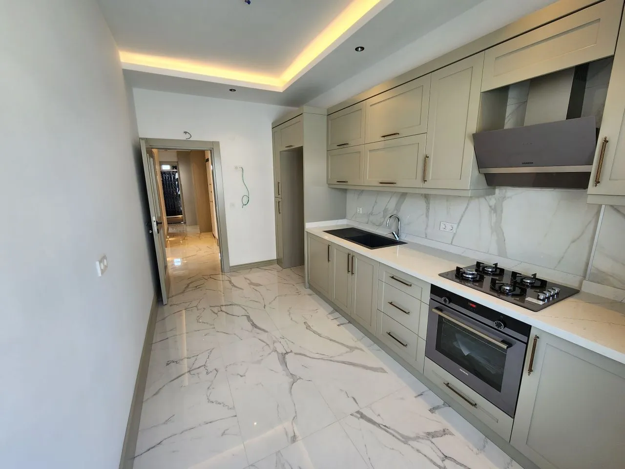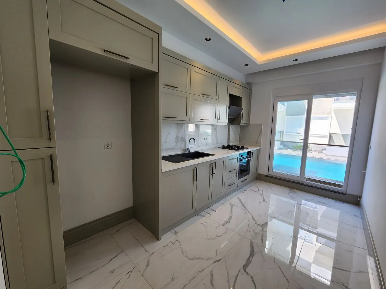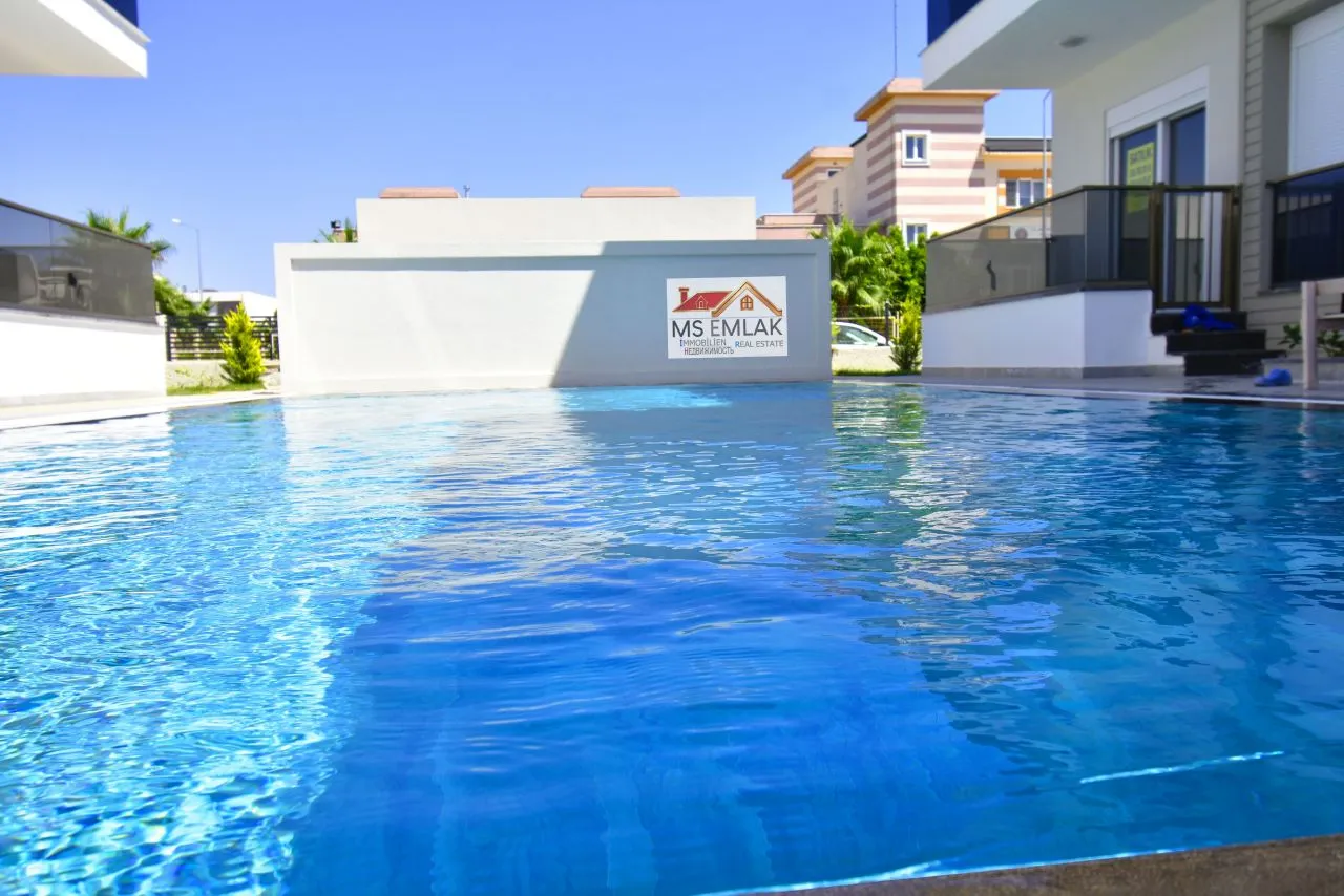 Квартира находится на участке, состоящем из двух блоков с большим бассейном и ландшафтным дизайном. Расположение участка высокое, просторное, легко добраться до рынка . В коридоре есть гардеробная, а на кухне встроенная плита и духовка марки Siemens. Вы можете купить эту прекрасную квартиру, которая расположена на первом этаже и впечатляет своим роскошным интерьером. В квартире три привлекательные комнаты. Что особенно стоит подчеркнуть, так это то, что у вас есть не только балкон, но и с балкона вы можете спуститься в сад дома. На территории также имеется хорошо оборудованная кухня и достаточно места для хранения посуды.