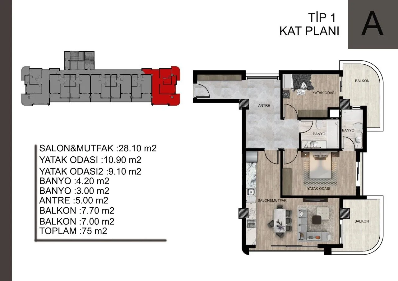 Площади квартир: 1+1 = 65m2 2+1=100m2 - Квартиры доступны на разных этажах