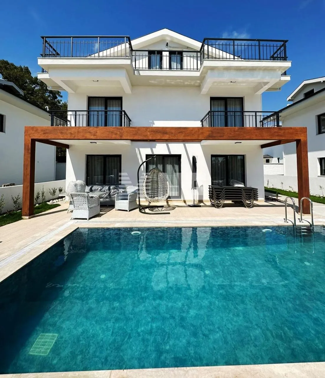 Светлая вилла находится в Фетхие. Характеристики: 4 спальни, 2 гостиные, 1 кухня, - новое здание, триплекс (3 этажа) отдельная вилла, вид на море со 2-го этажа, частный бассейн, частный сад, кондиционер, отопление, частная автостоянка. Новая мебель и кухонная техника включены в стоимость. Дом построен на участке площадью 400 м2. Инфраструктура: 2,5 км до моря, 400 метров до супермаркета, 7 км до Олюдениза (Голубая лагуна), 4 км до центра Фетхие. Доступен местный транспорт.