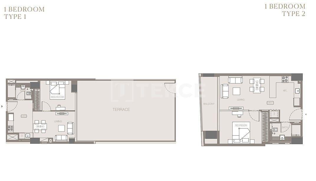 В комплексе представлены разные типы квартир: студии, а также квартиры с 1 и 2 спальнями. Некоторые типы квартир в проекте имеют джакузи на балконах, некоторые – частные бассейны, а некоторые – большие террасы с великолепными видами на Бурдж-Халифу и центр города. Балкон, кухня открытой планировки, гардеробные шкафы, кухонная техника (варочная панель), кухонные шкафы, шкафы в ванной комнате будут предусмотрены в стандартной комплектации во всех типах квартир. Кроме того, в квартирах с 1 и 2 спальнями предусмотрены прачечные, ванные комнаты и кладовые.