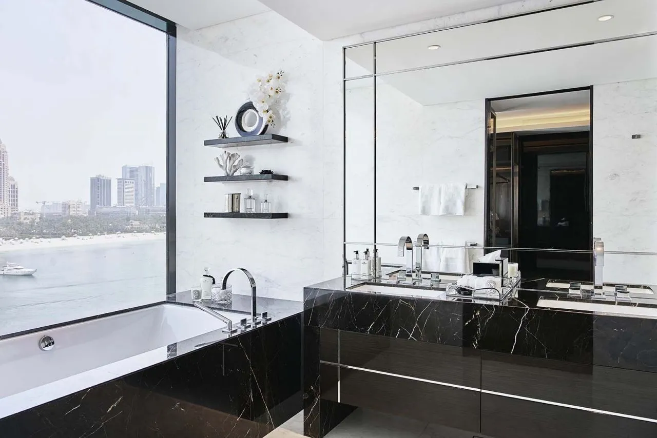 Одной из главных роскошных особенностей гладкой и элегантной ванной комнаты является большая ванна с видом на море, небо и город, что действительно является признаком по-настоящему богатой жизни.