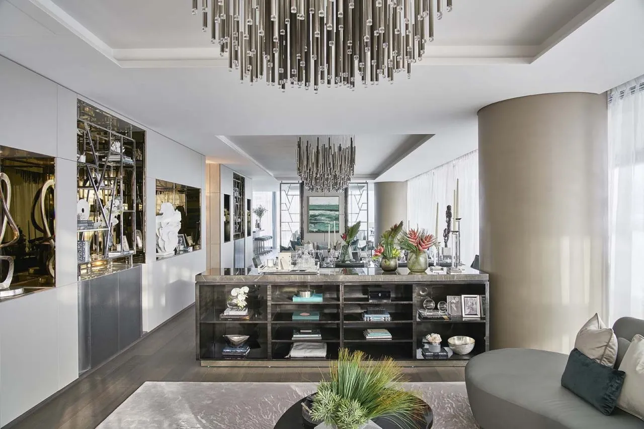Признанные лондонские дизайнеры из Elicyon создают уникальные индивидуальные пространства, которые превращают роскошный интерьер в произведение искусства. Натуральные материалы и отделка, от лакированного дерева и кожи до камня и шелка, сочетаются друг с другом в гламурной и элегантной моде. Разнообразные элементы, материалы и текстуры, такие как гладкий мрамор, разные формы из стекла и хрусталя, а также морские оттенки создают преемственность между внутренним пространством и потрясающим внешним пейзажем, который вдохновил его.