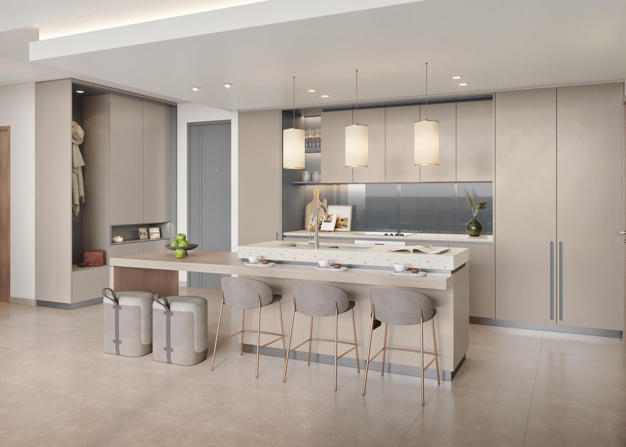 Это 7-этажный комплекс со студиями и квартирами с 1-3 спальнями. Все лоты продаются с чистовой отделкой, встроенной кухонной техникой и сантехникой. У вас будет 1 или несколько уютных балконов с видом на зелёный двор с бассейном и верандой. Сдача – 1 квартал 2026.