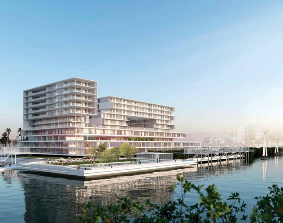 Частный пляж с причалами для яхт и парк